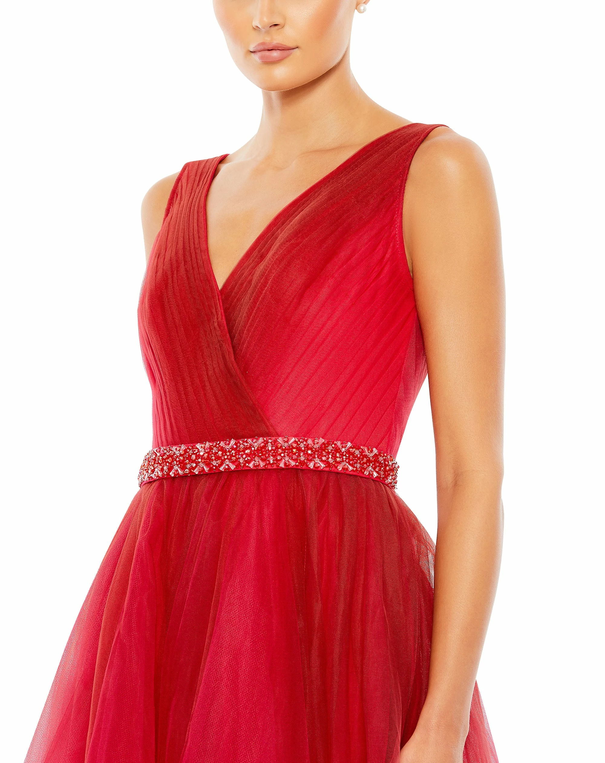 For galas, formal affairs or senior prom, this gown makes you the most alluring women in the room. The head-turning number is exquisite in ombré tulle with a structured, pleated bodice, jeweled waist, belt, and royalty-worthy ball gown skirt. The dress flaunts a sensual low back and sweep train finish.