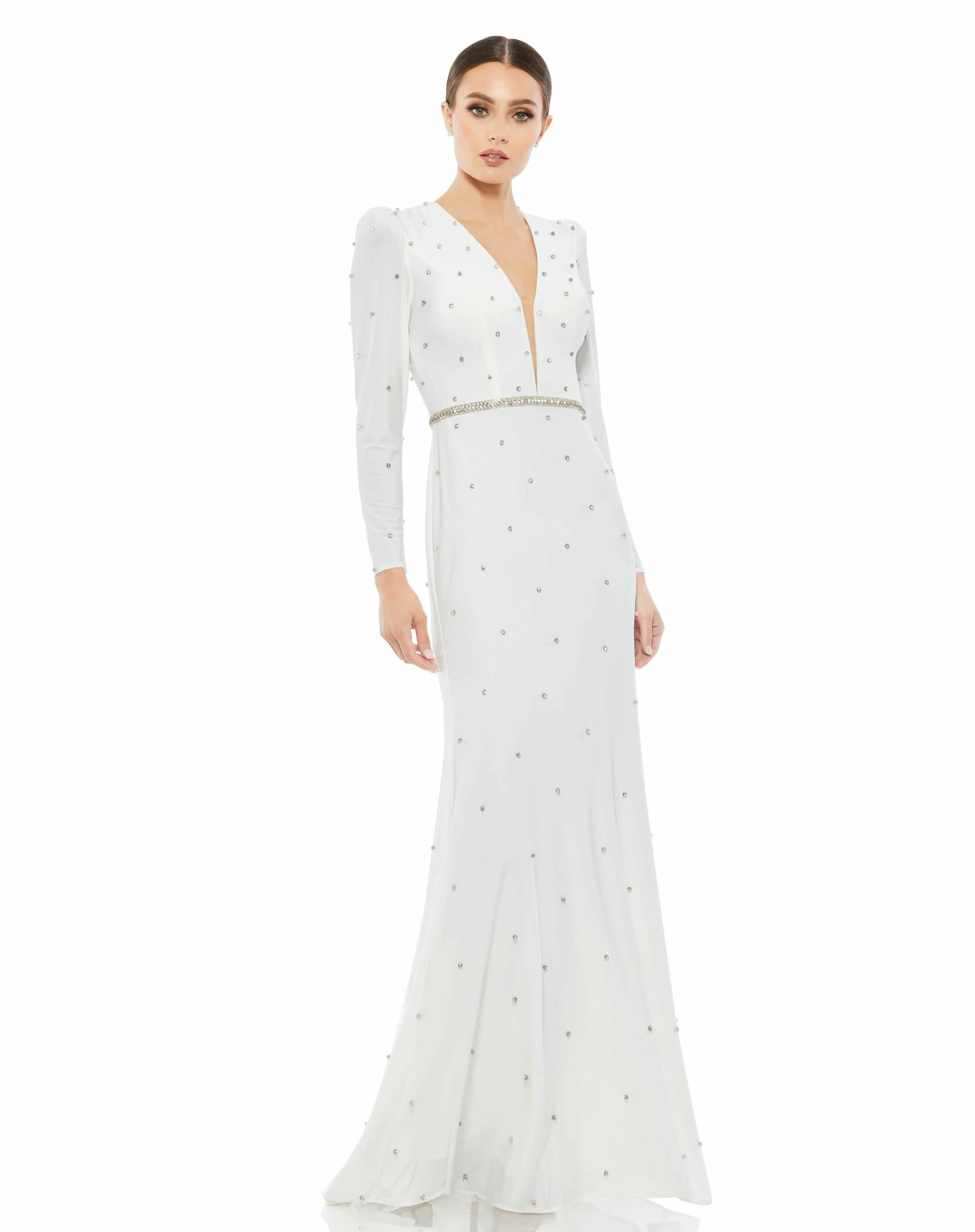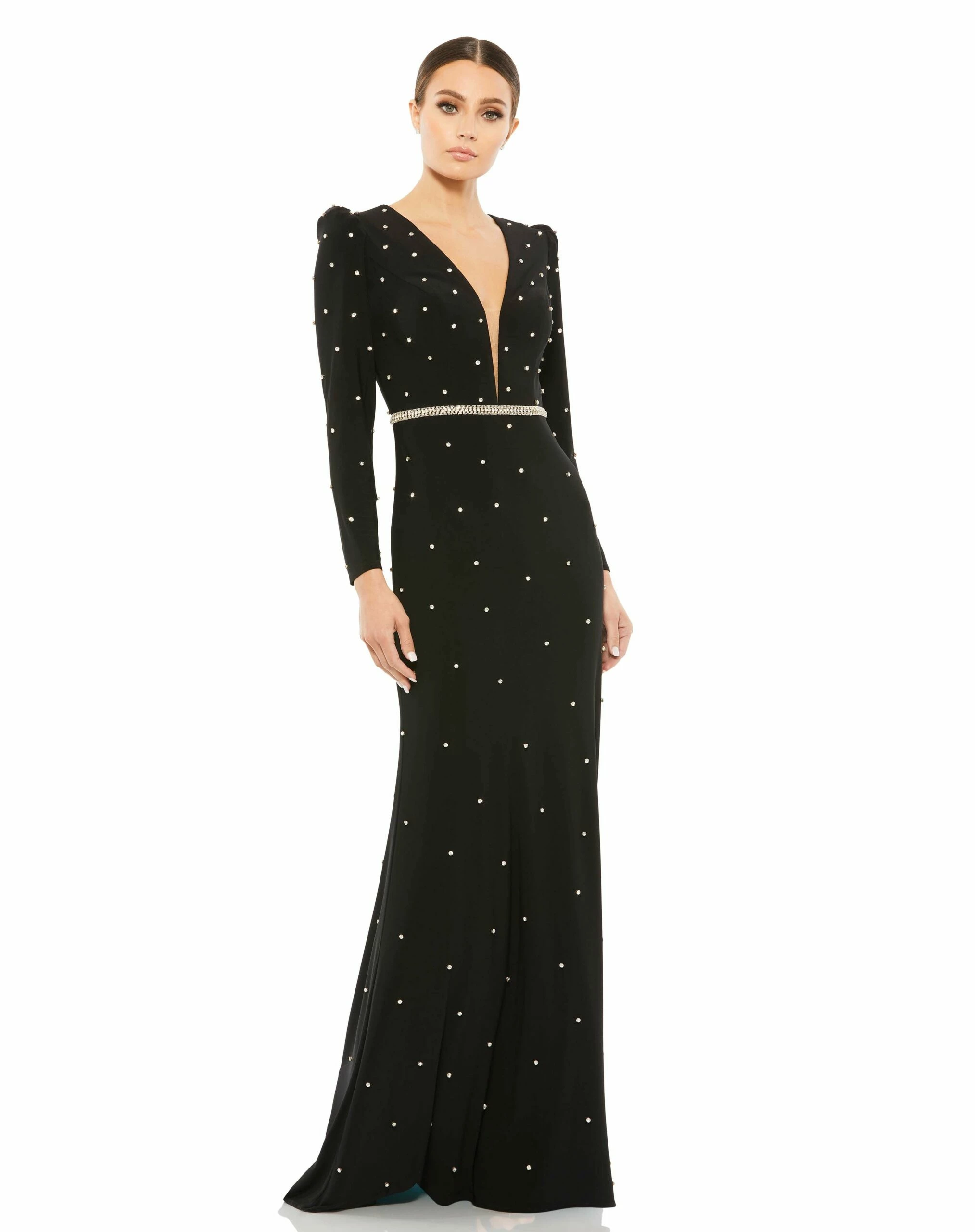 Belted Jewel Encrusted Plunge Neck Long Sleeve Gown
