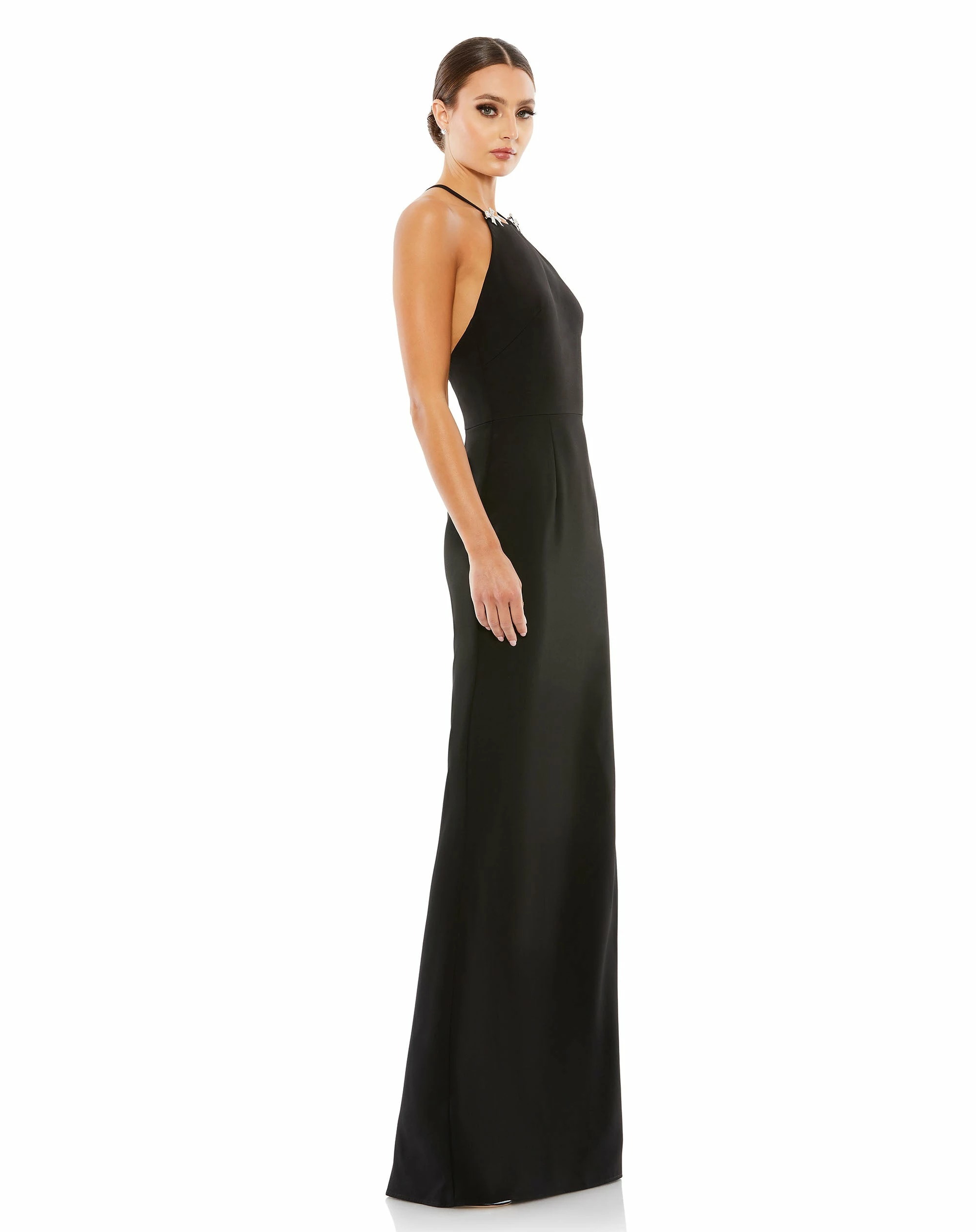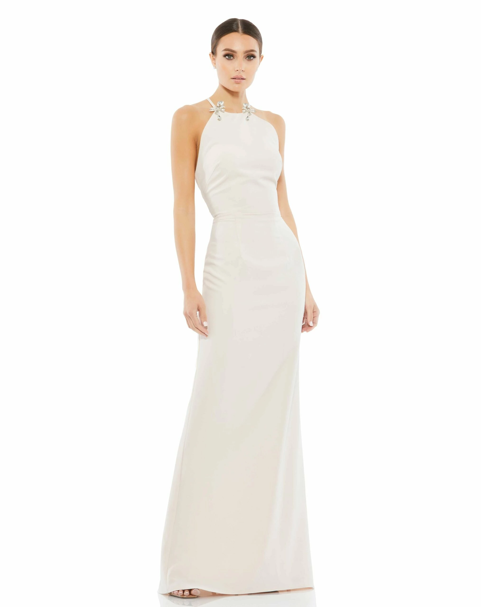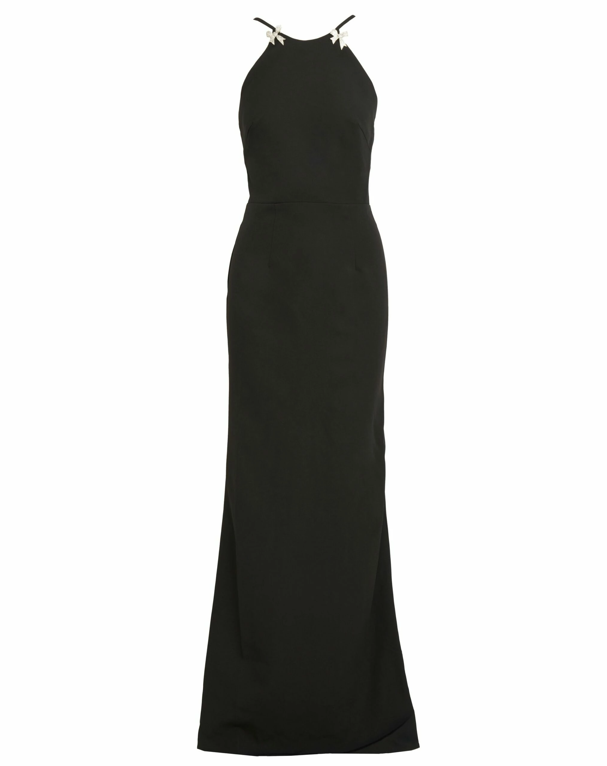 Looking for a dress that’s timeless and memorable? This perfect-fit gown has all the qualities of an iconic style. It’s crafted from sleek, solid crepe in a column silhouette and tailored with darting for a shapely fit. The bodice is designed with cutaway shoulders and detailed with jeweled pear-shaped drops and bows at the tops of slim straps that crisscross at the back.