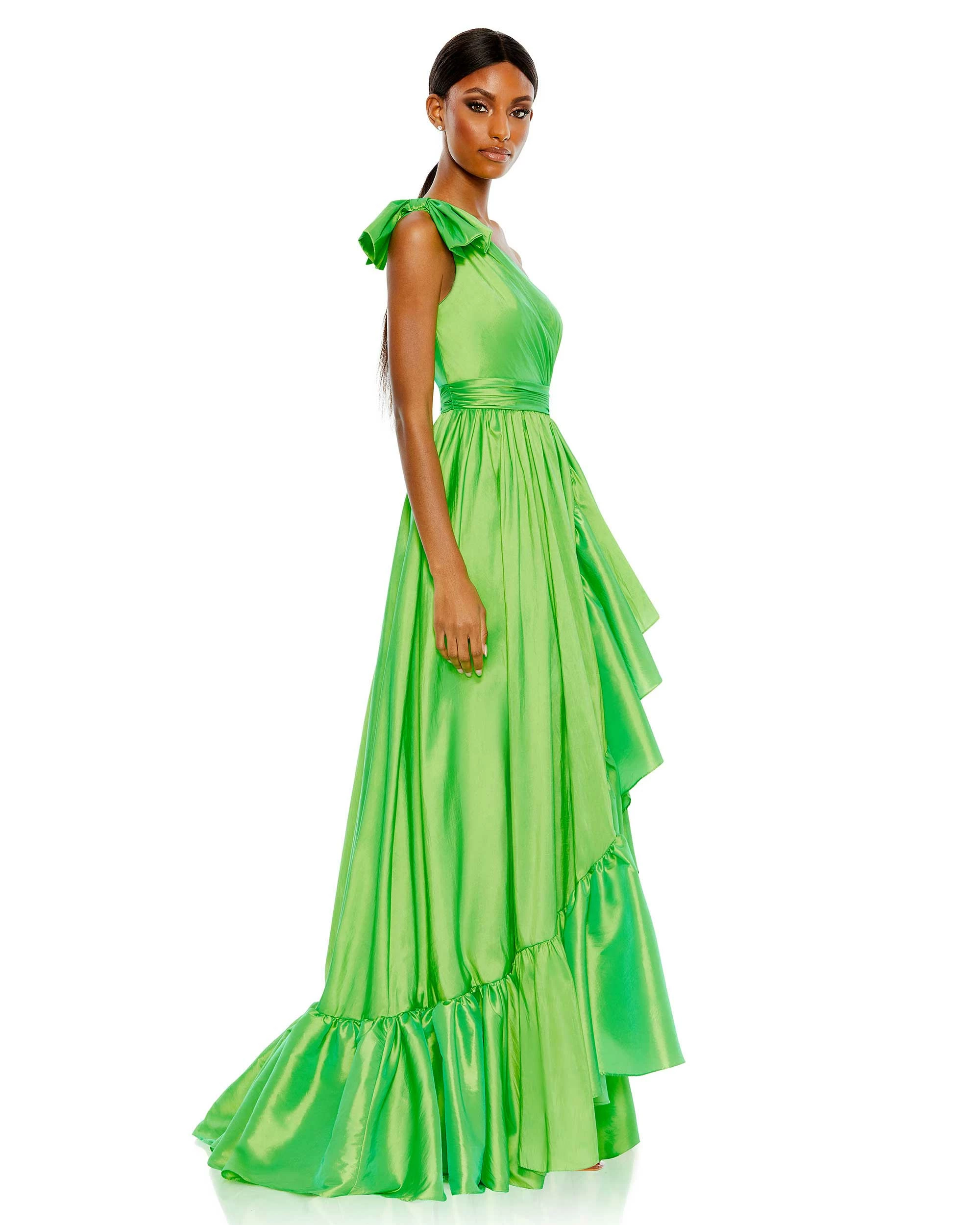 Softly tailored for an artful design and impeccable fit, this dress is a masterpiece in every sense of the word. Crafted from iridescent taffeta, the gown is styled with a bow-topped shoulder, a cascading oversized ruffle, and a high-low hem. Pleats and gathers add pretty texture to enhance the look.
