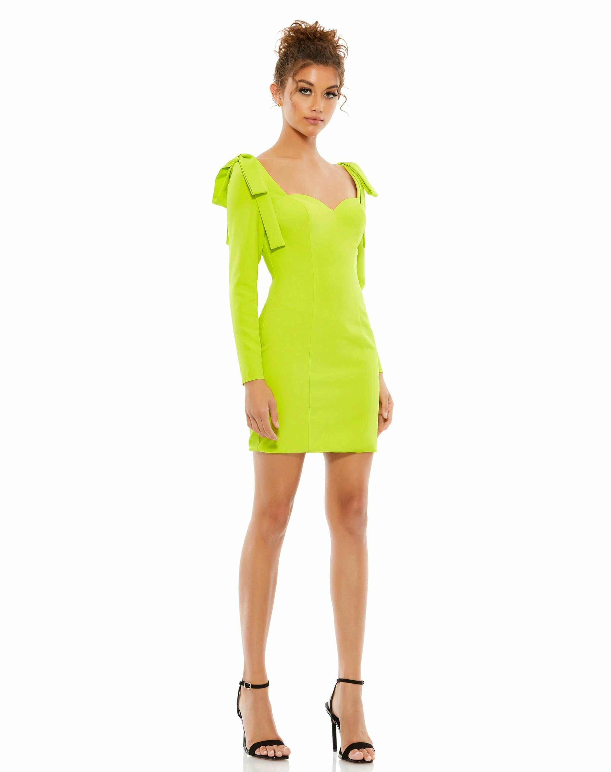 Long-sleeve minis are having a moment, and this hot little number proves the look—with a perfect balance of coverage and bare skin—is worthy of your precious closet space. The solid sheath is tailored with a contemporary Queen Anne neckline, bow-topped shoulders and slimming seams. Wear yours with barely-there stiletto sandals for a sexy, leggy look.