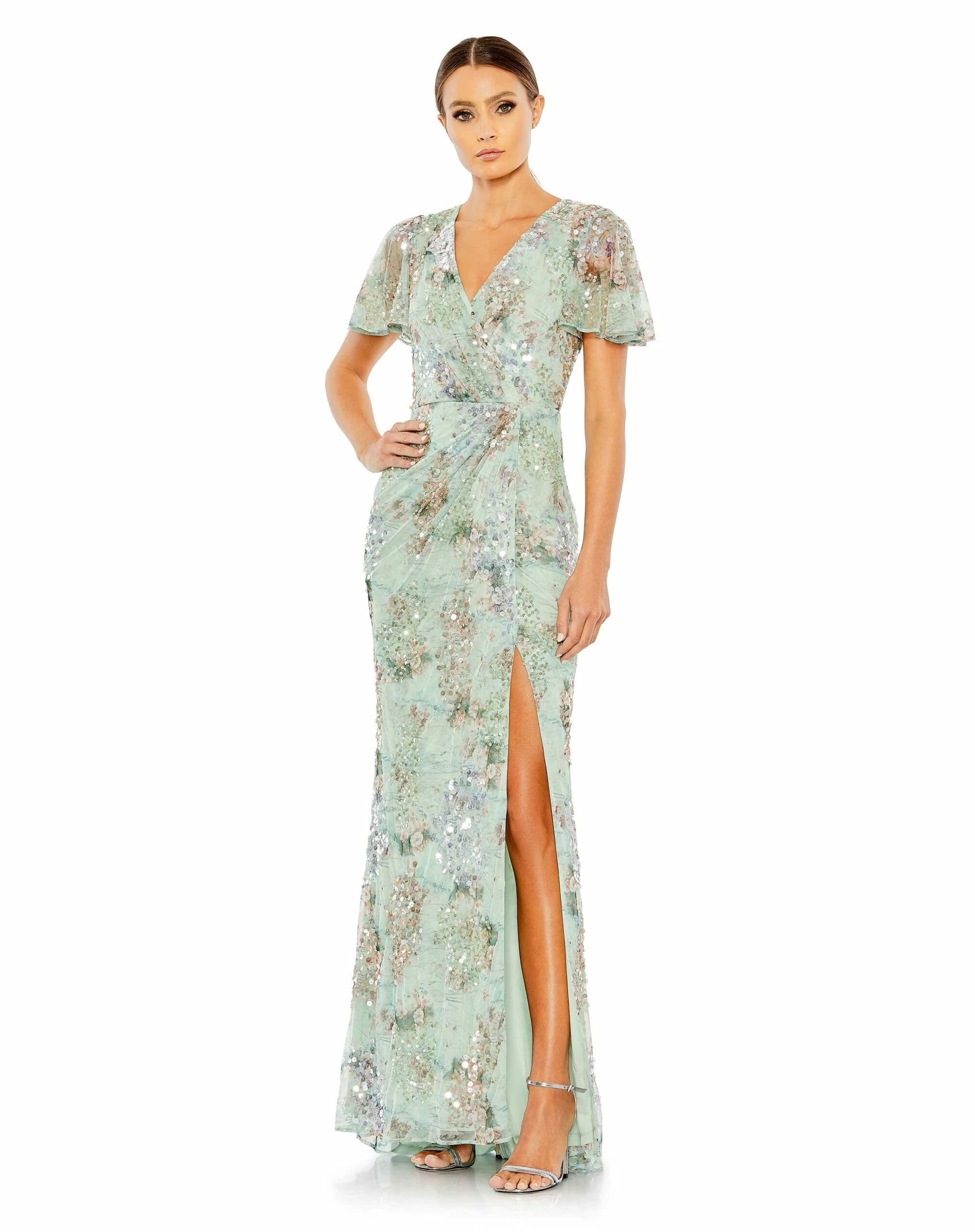 Embellished Butterfly Sleeve Faux Wrap Gown
