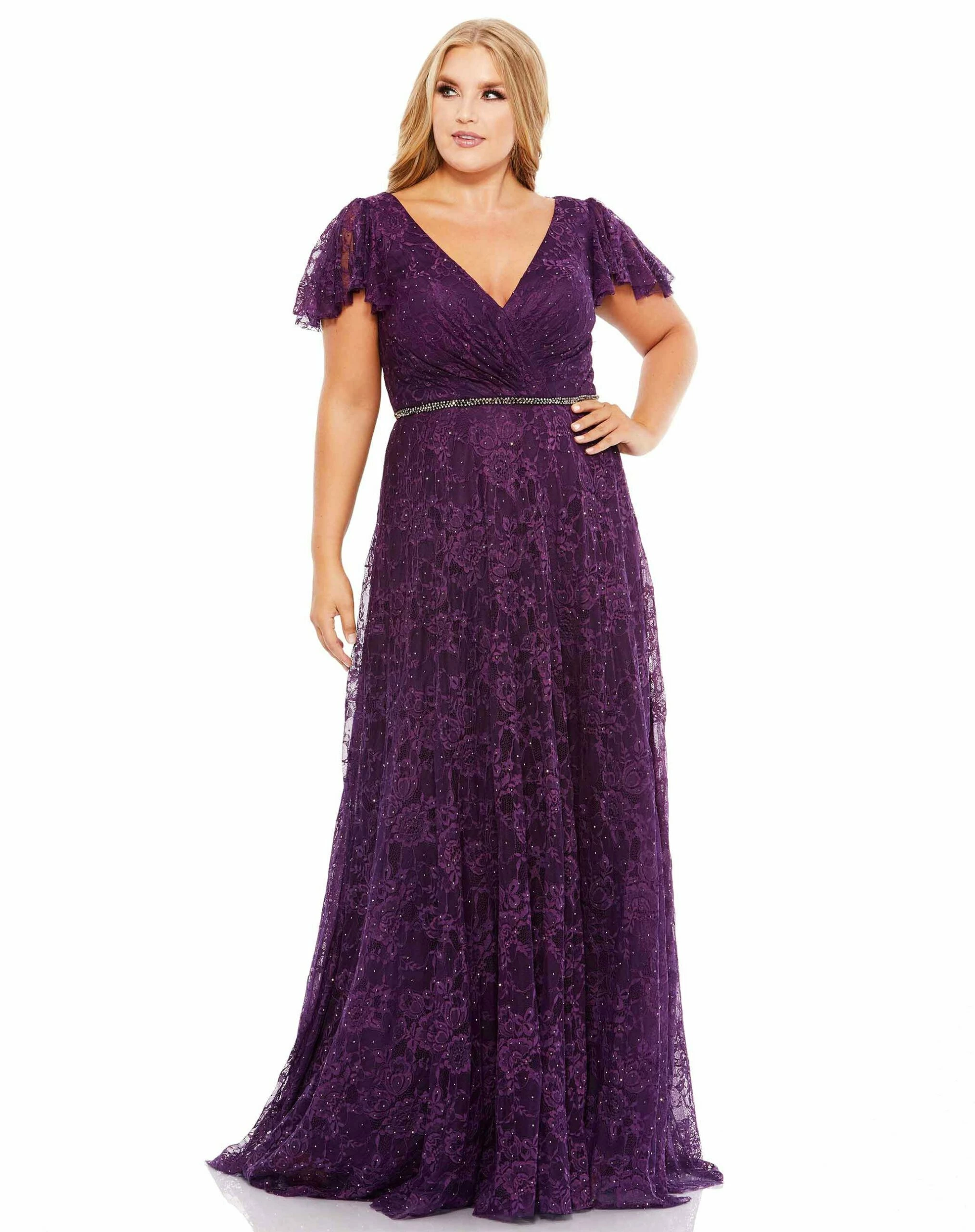 Embellished lace gown with a rhinestone belt and delicate flutter sleeves.