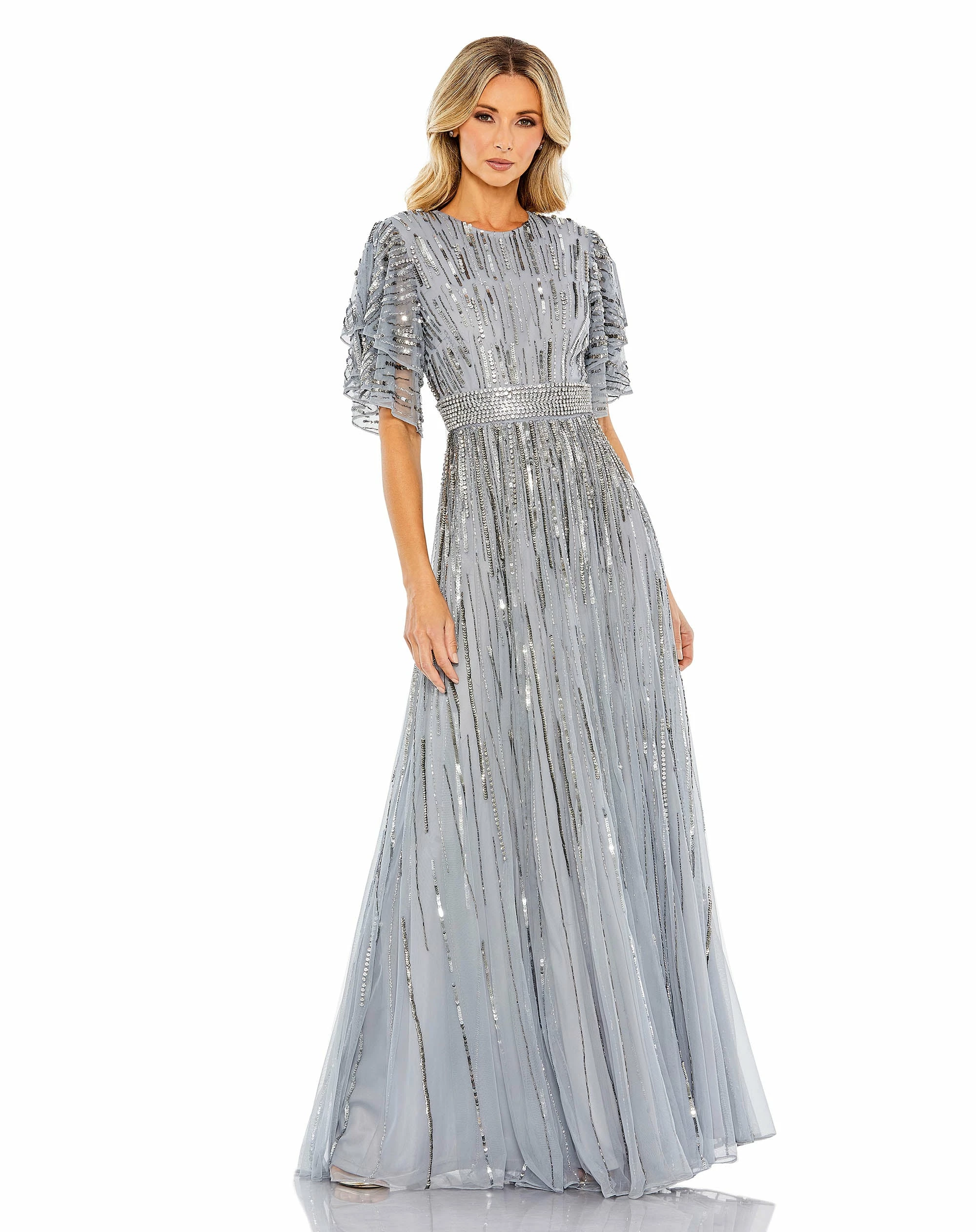 Stunning full-length gown with allover sequin and beaded stripe embellishment. Gown features a round neckline, layered short sleeves, and a dramatic bejeweled belt at the waist.Â