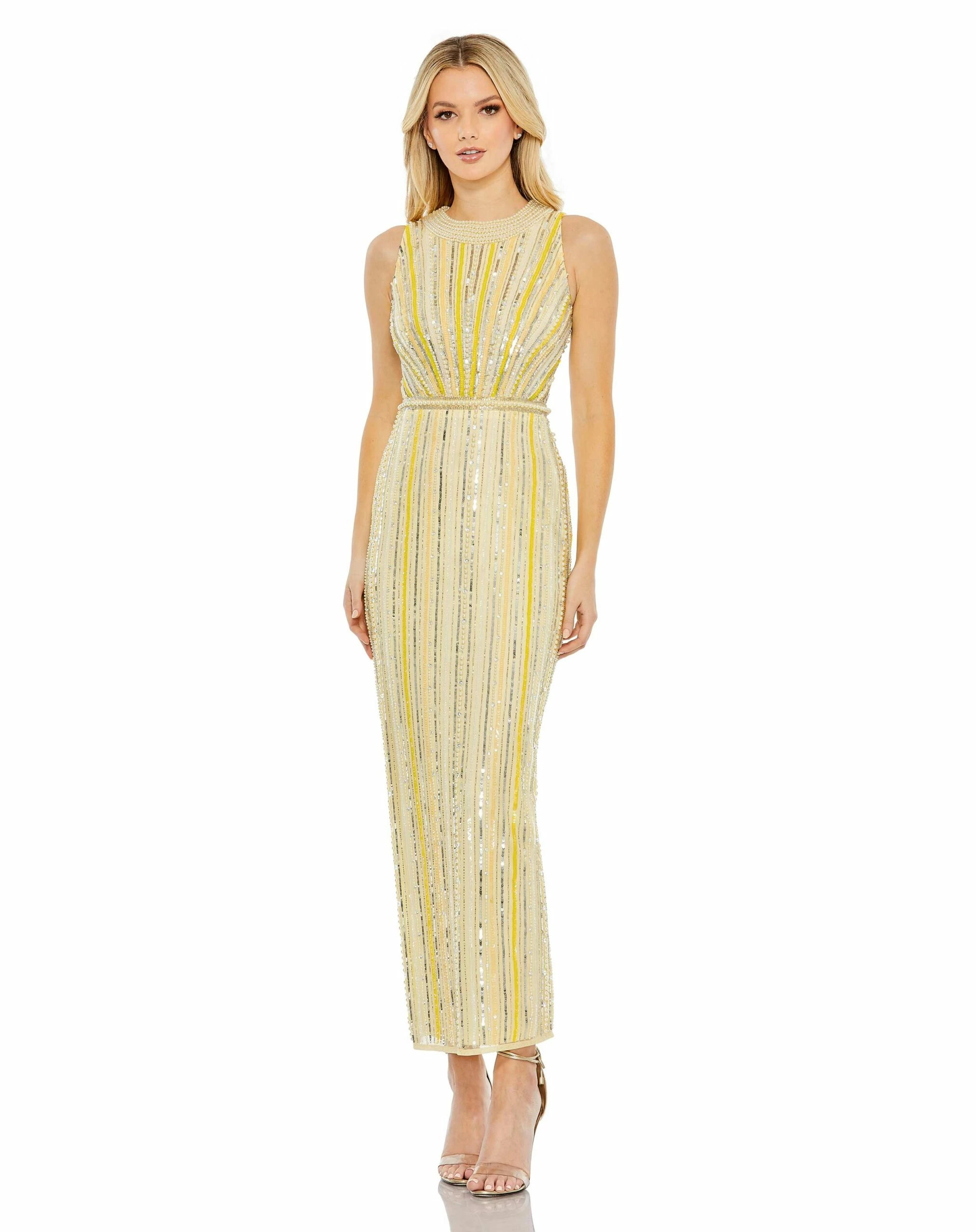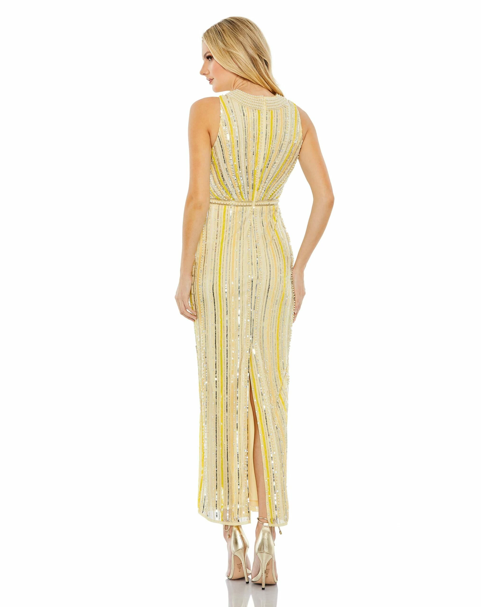 This stylish, hand-embellished dress features a halter neckline, column silhouette, and sequin striped detailing throughout the body. It is fully lined through the body and features a beaded neckline and belt details, making it an eye-catching choice. The back zipper ensures a great fit for any special occasion.Â