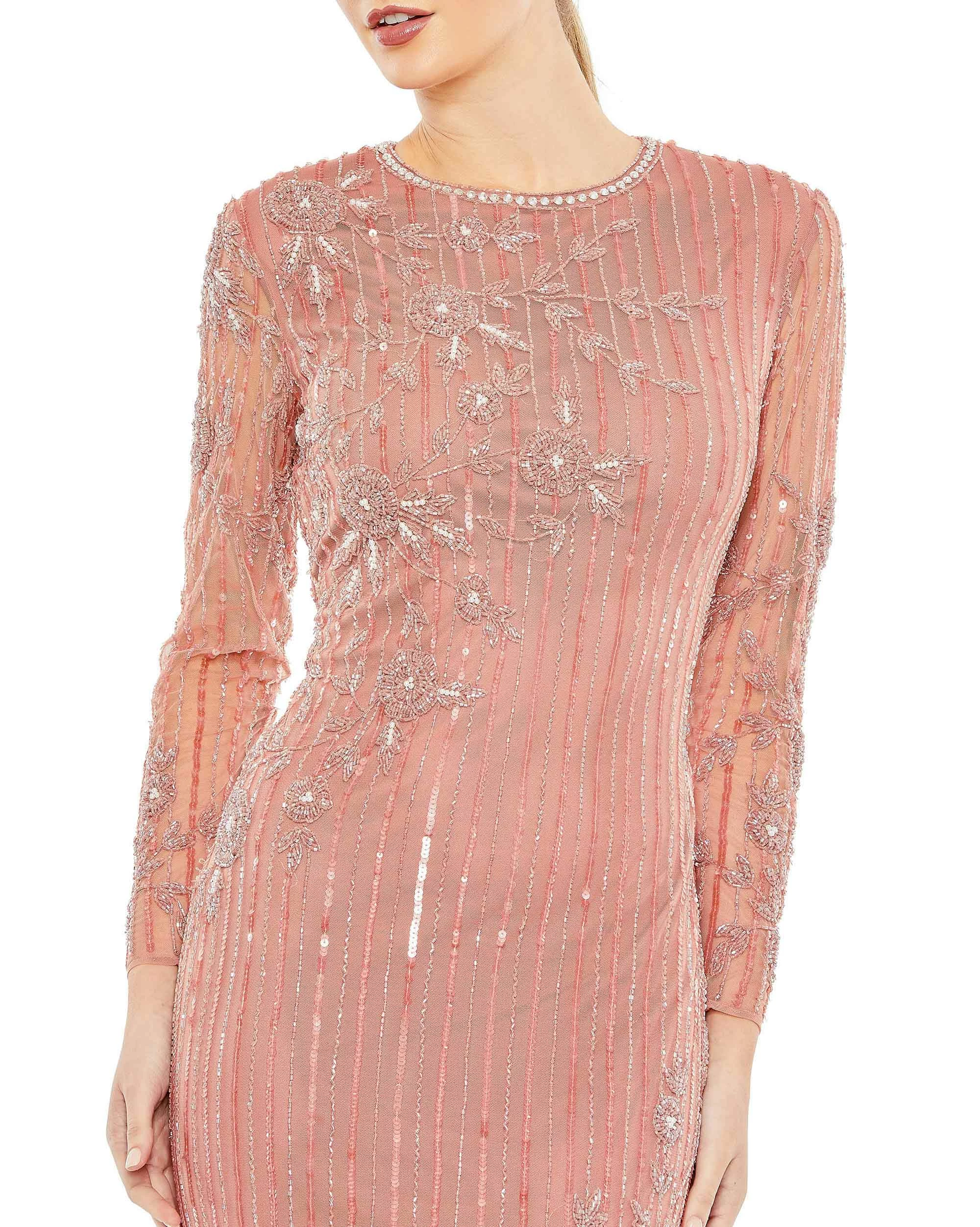 - All-over vertical rows of hand-stitched sequins featuring intricate floral beading