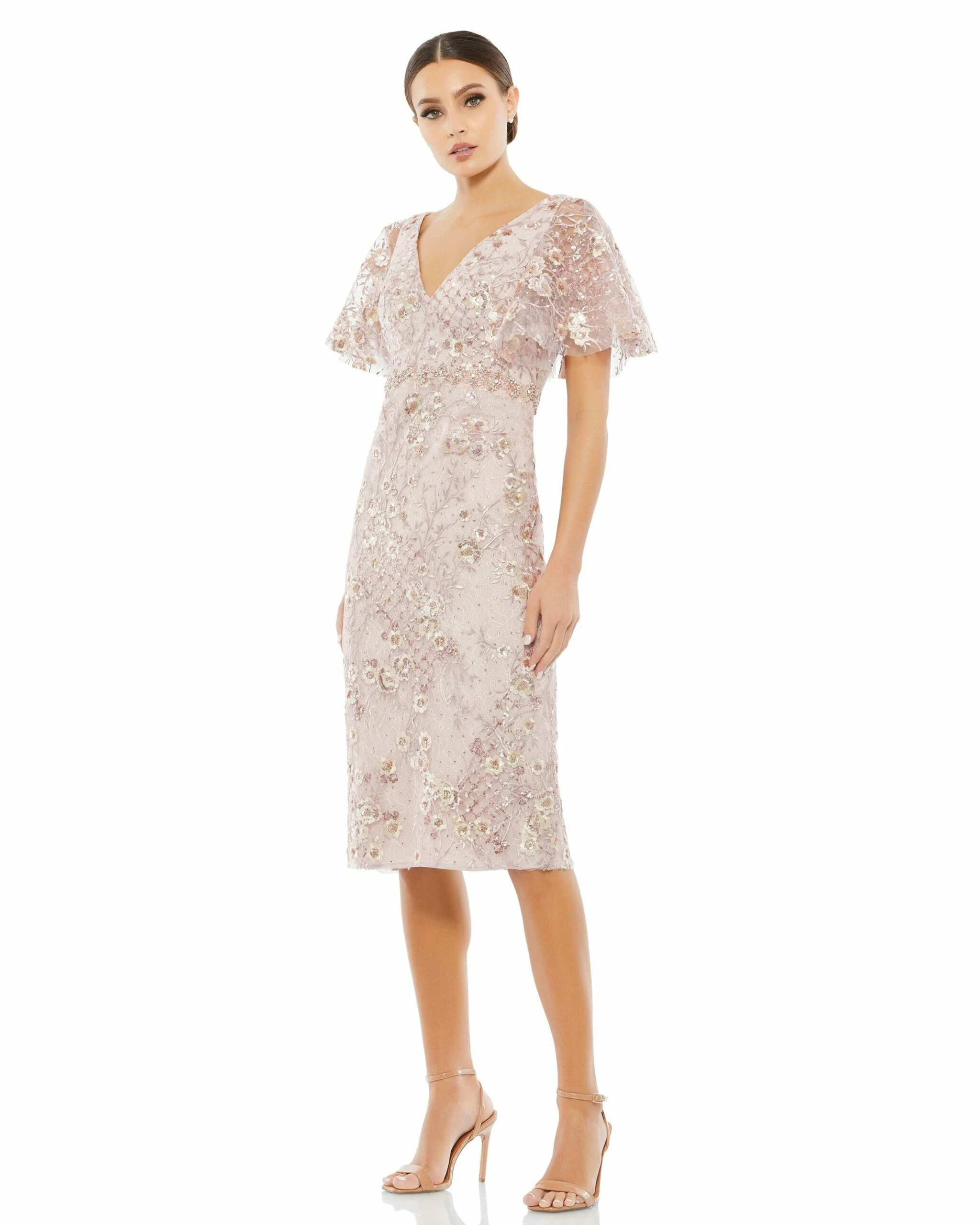Floral midi dress featuring plunging v-neckline, illusion short sleeves with floral detail, and a beaded belt at the natural waist.Â
