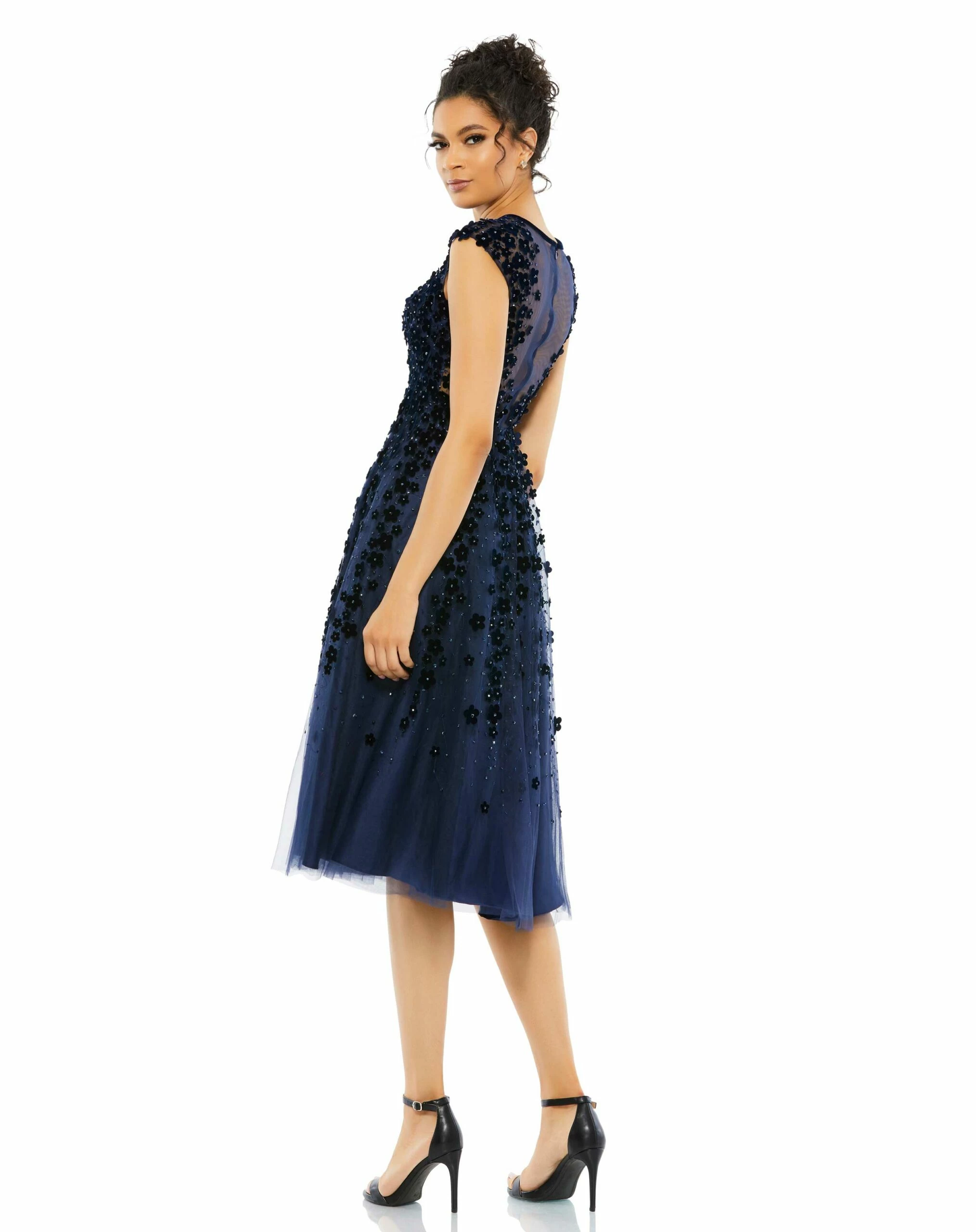 Embellished Illusion High Neck Cap Sleeve Midi Dress