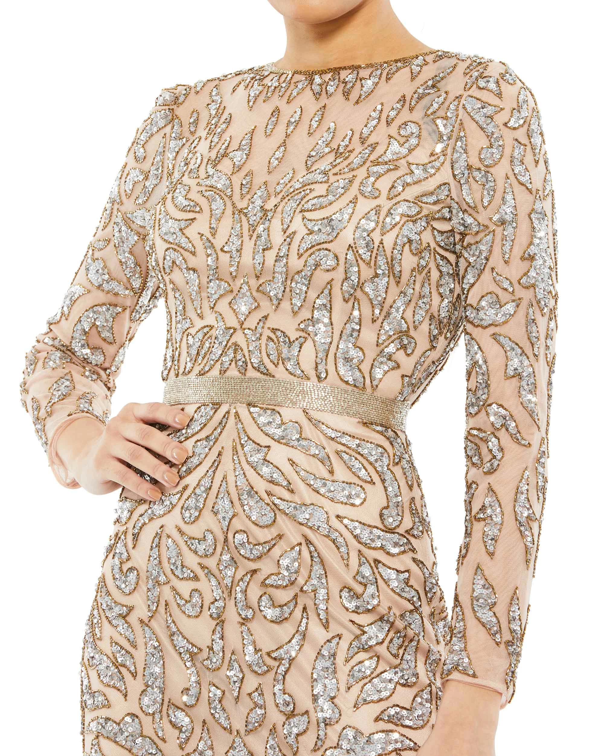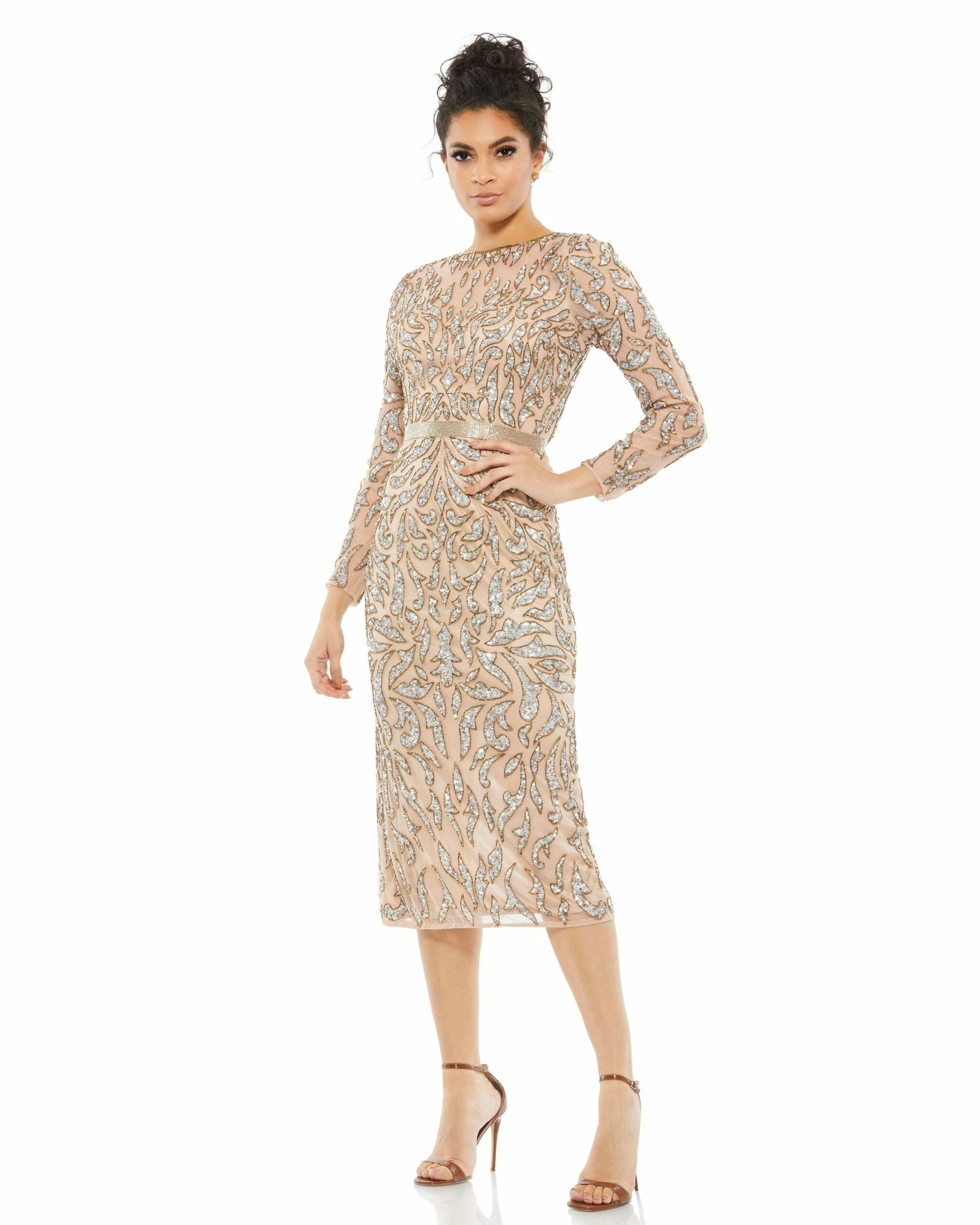 It’s your time to shine in this embellished sheath dress. The monochrome dress is decked with sequined and beaded shapes that add flair to the sleek silhouette featuring an illusion neckline, slim long sleeves and a back slit. Add pumps and an envelope clutch for holiday parties and seasonal soirées.