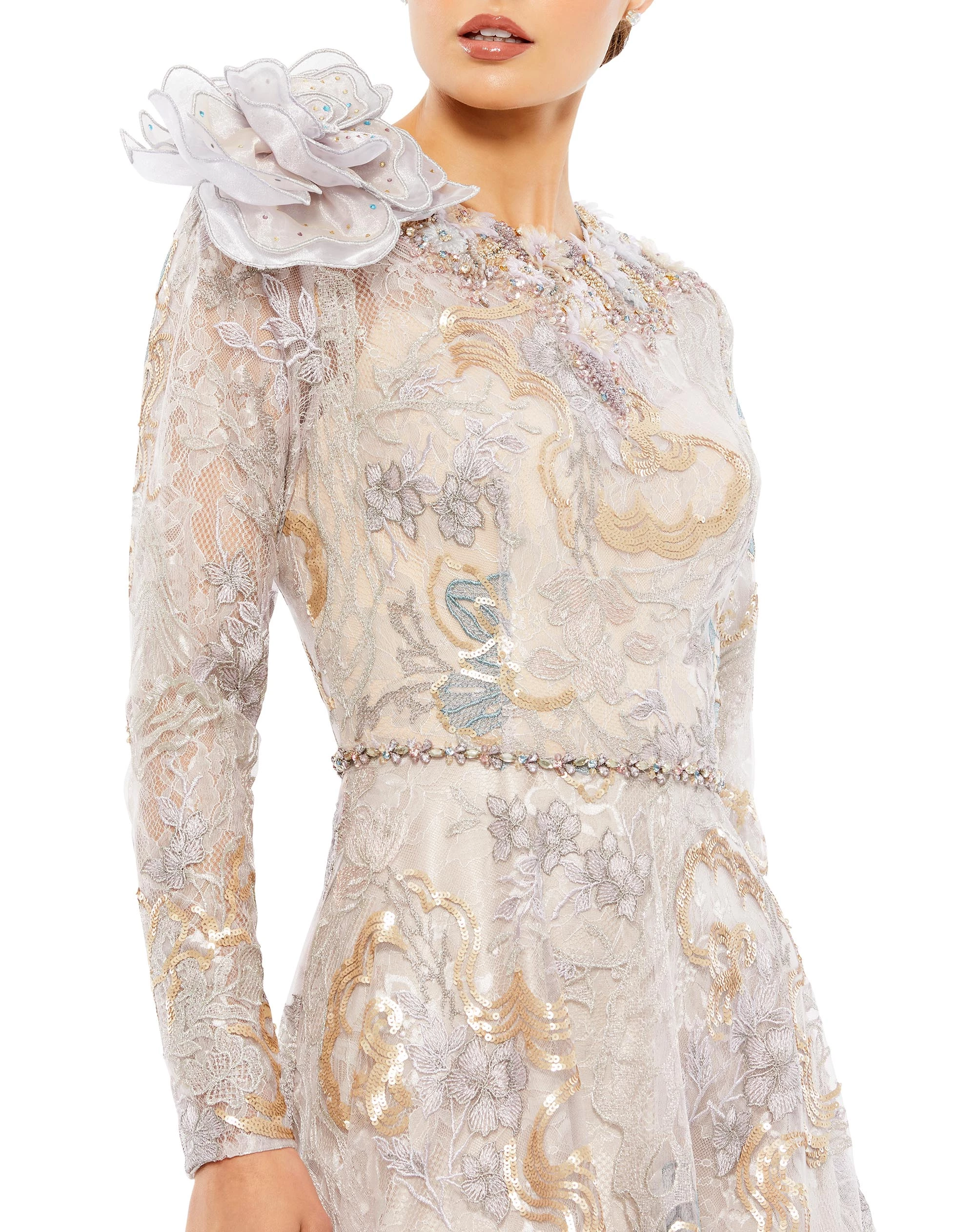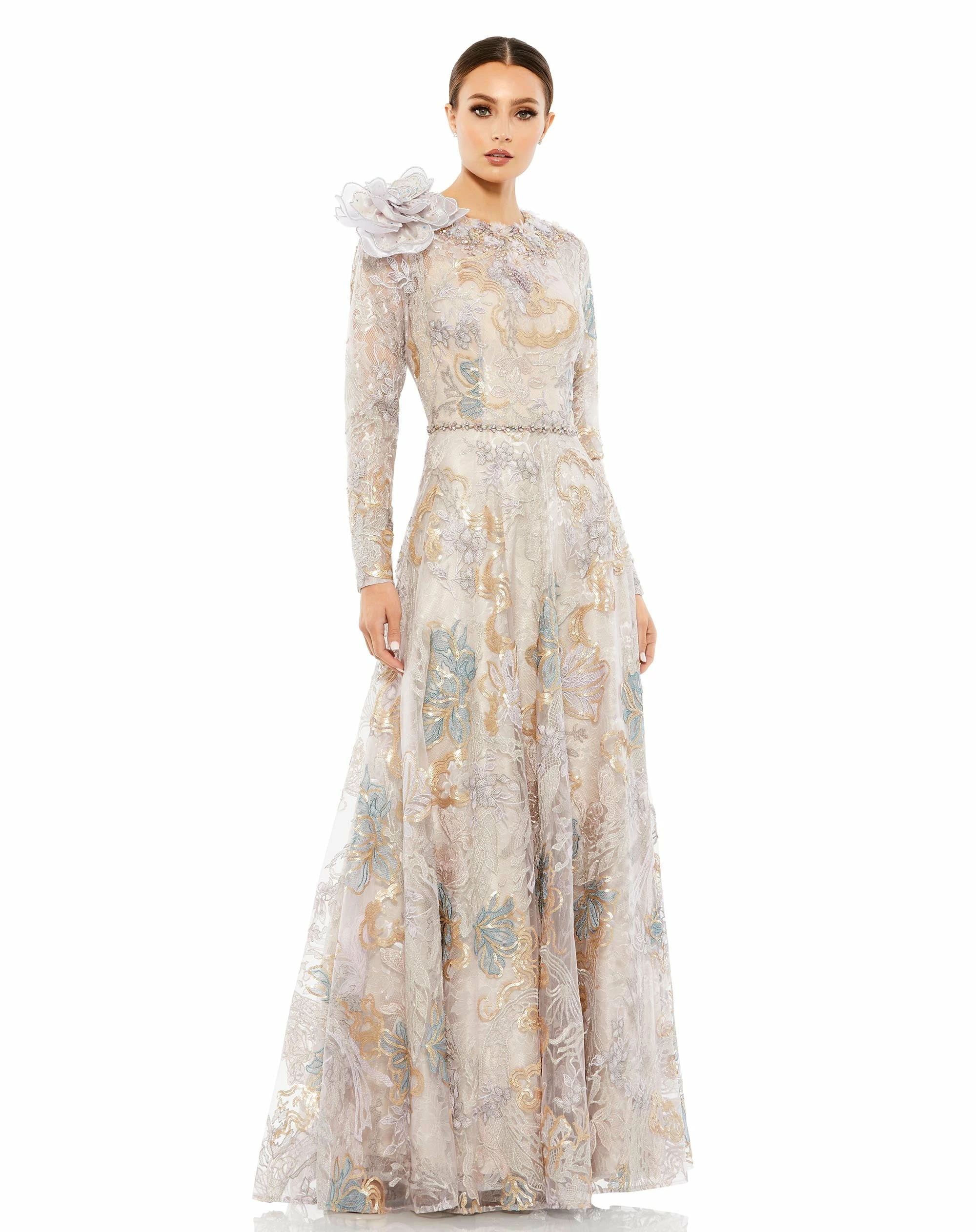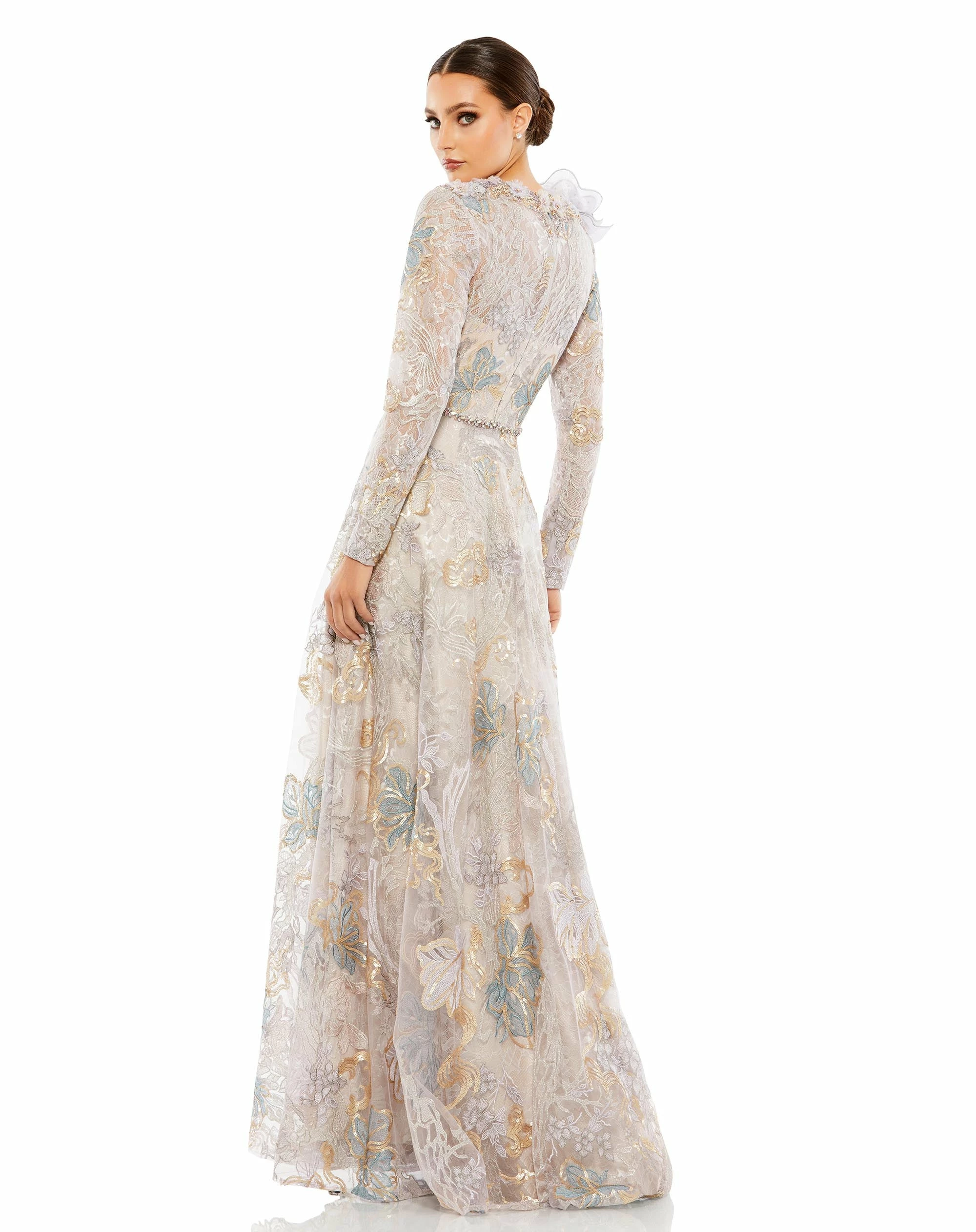 Embellished Long Sleeve High Neck Rose Applique Gown