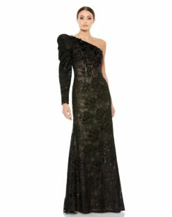 This gown goes from one breathtaking detail to the next, opening with an asymmetrical neckline and a dramatic, leg-of-mutton sleeve. Clusters of garden-inspired paillettes and beads adorns the topline, while the rest of the dress is embroidered with beautiful roses filled in with shimmery sequins.