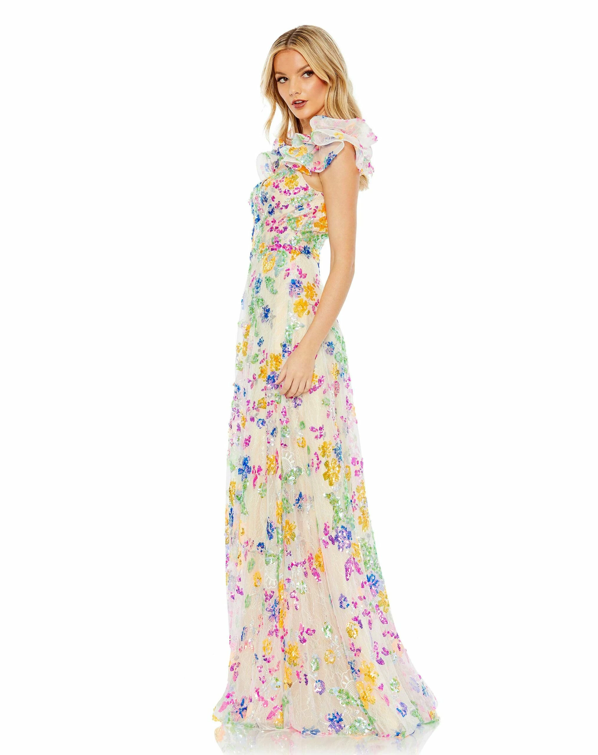 Beautiful, contemporary, whimsical, unique—this gown is all that and more. Patterned with a garden motif of brightly colored sequins, the gown’s luminous detail adds a fresh, eye-catching update to an embroidered lace base. The dress is styled with a sweetheart neckline, rosette-inspired ruffled sleeves, and plunging back.