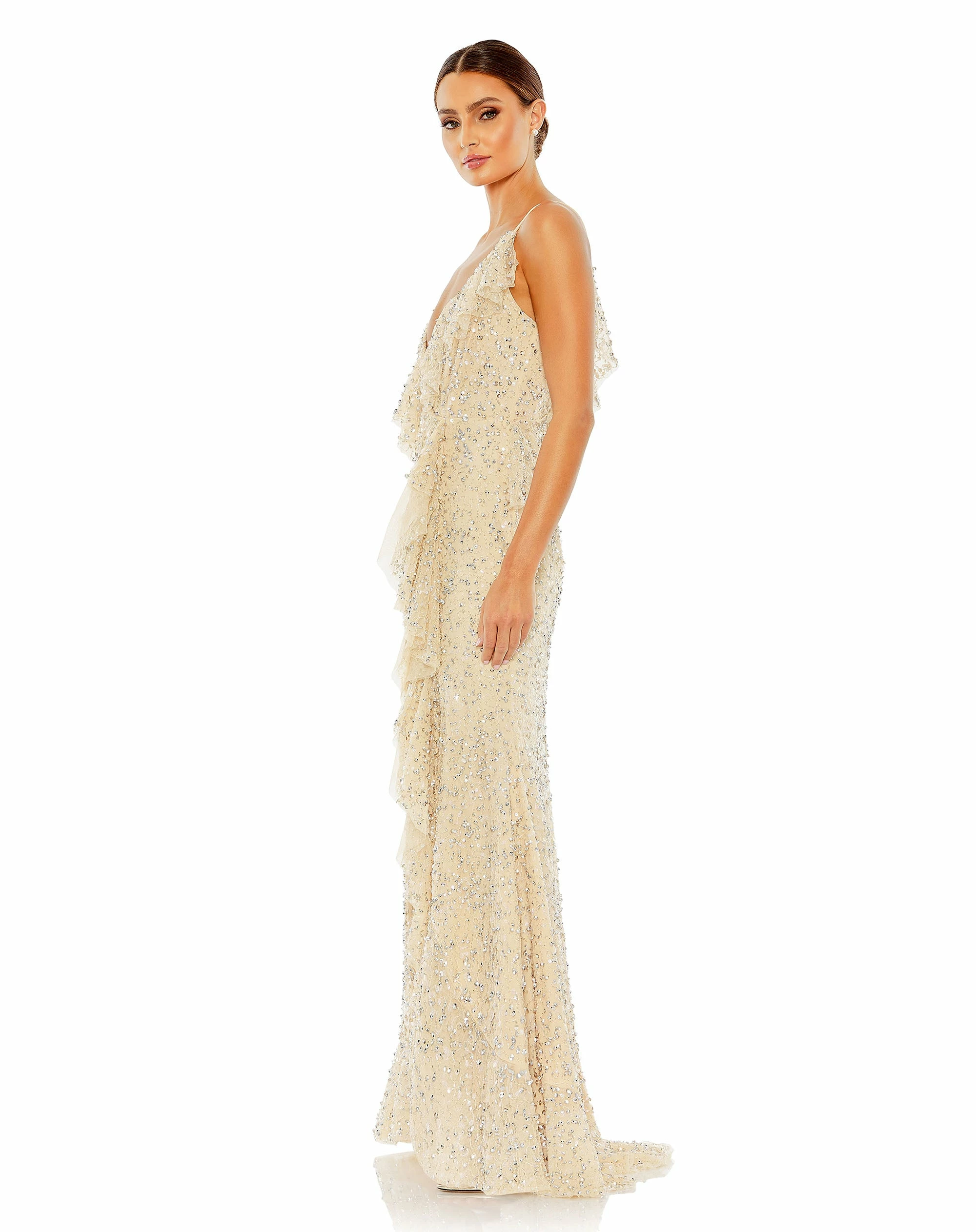Asymmetrical sleeves are one of the yearâs biggest trends. Work the look on this modern fairy tale dress made from ultra-fine netting sprinkled with shimmery sequins. The dress is styled with a deep surplice neckline, incongruent sleeves, and a ruffle-flanked slit.