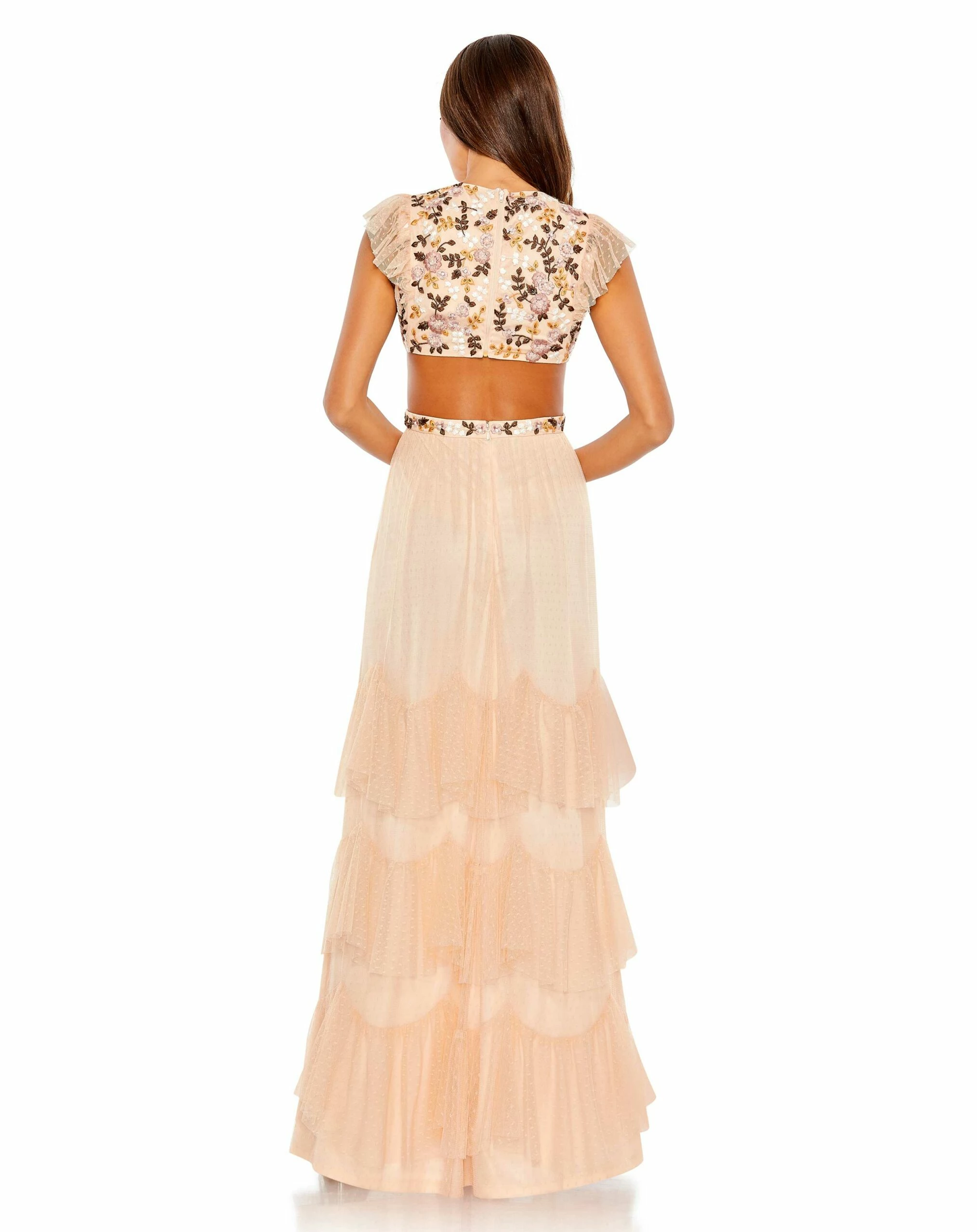 Embroidered Bodice Cap Sleeve Ruffle Tiered Gown