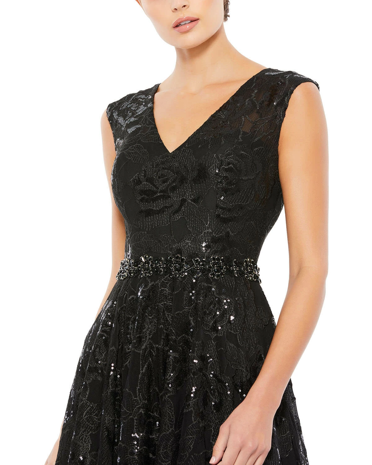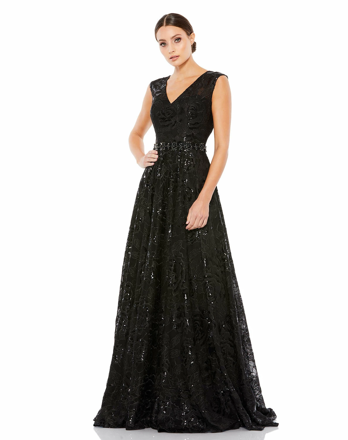 Black sequin evening gown with a v-neck and beautiful sequin detail.