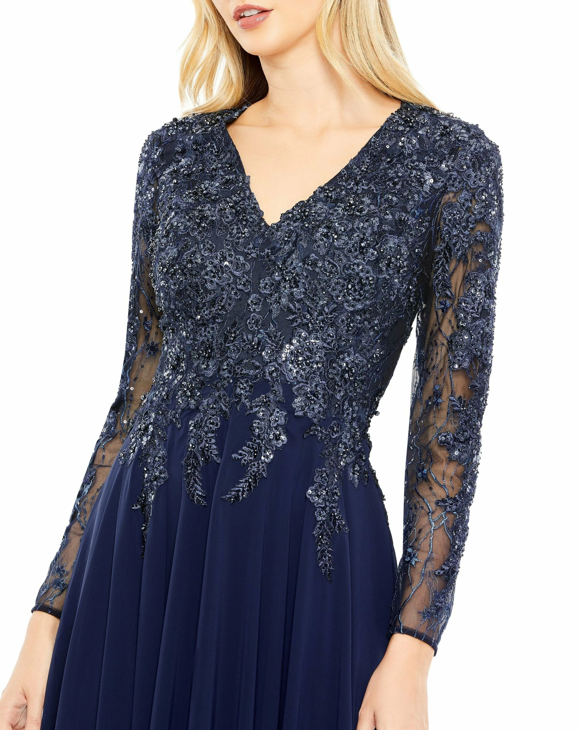 Embroidered Illusion Long Sleeve V Neck Gown
