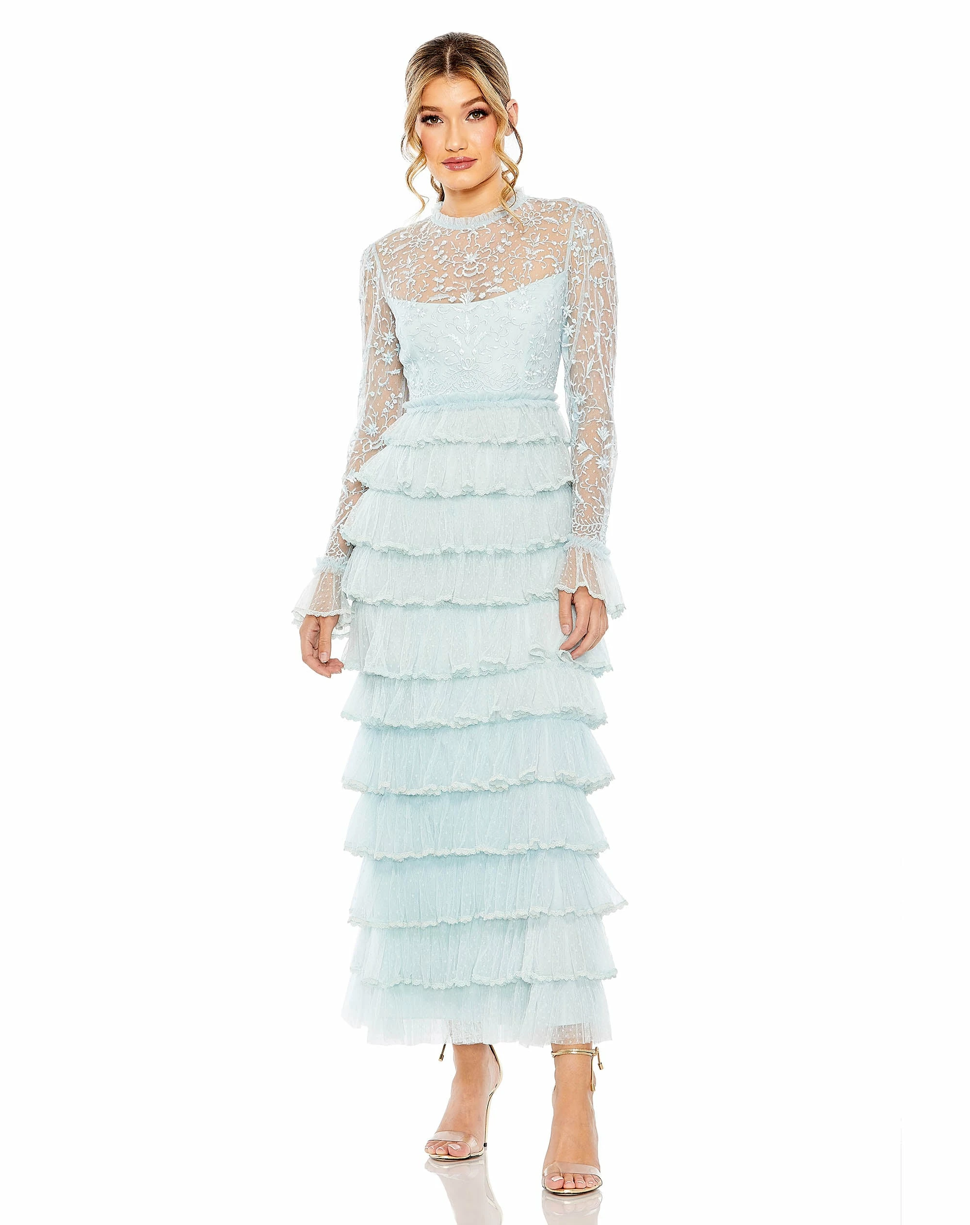 - Partially lined bodice; fully lined skirt; sheer unlined sleeves