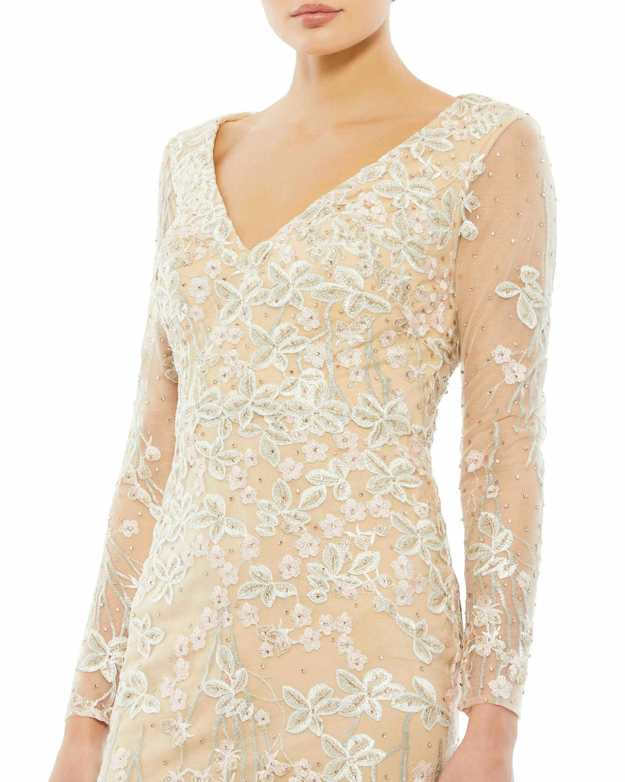Embroidered V Neck Long Sleeve Trumpet Gown