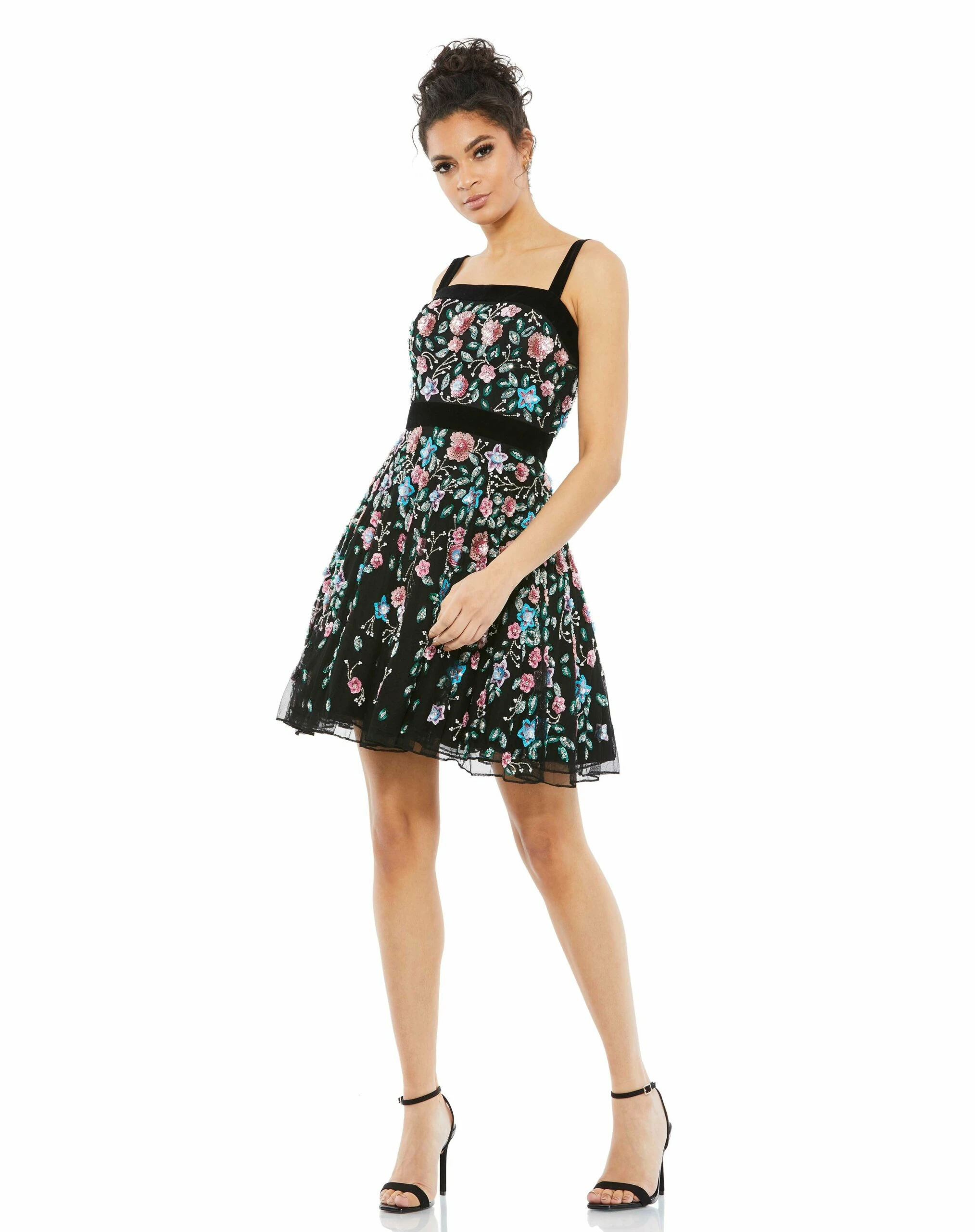 Fashioned from netting topped with romantic floral-arranged sequins and velvet trim, this dress is the perfect application of bright blooms during a cold spell. Pretty and charming, the sleeveless dress is a great short-hemline option for semi-formals and parties.