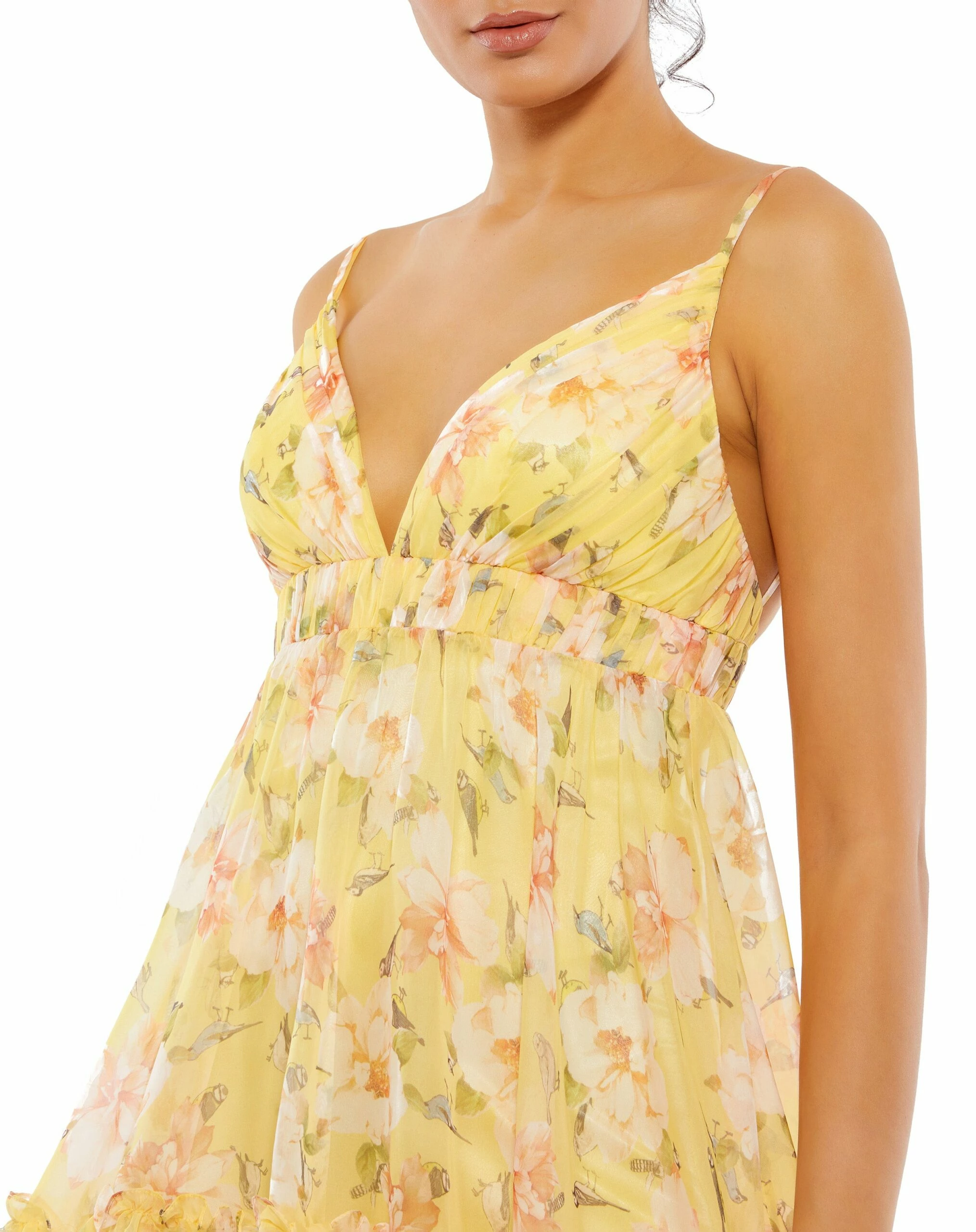 Floral-printed spaghetti strap babydoll dress with a ruched bodice and empire waistband, deep-v neckline, strappy back, and a flirty ruffled bottom hem.