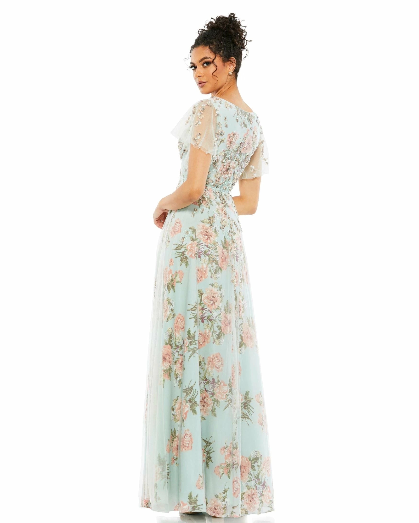 Floral printed gown with a pleated faux-wrap bodice, v-neckline, and floor-length skirt. Delicate mesh flutter sleeves and mesh overlay feature intricate beaded accents, and the natural waist is defined by a thin hand-beaded belt.Â