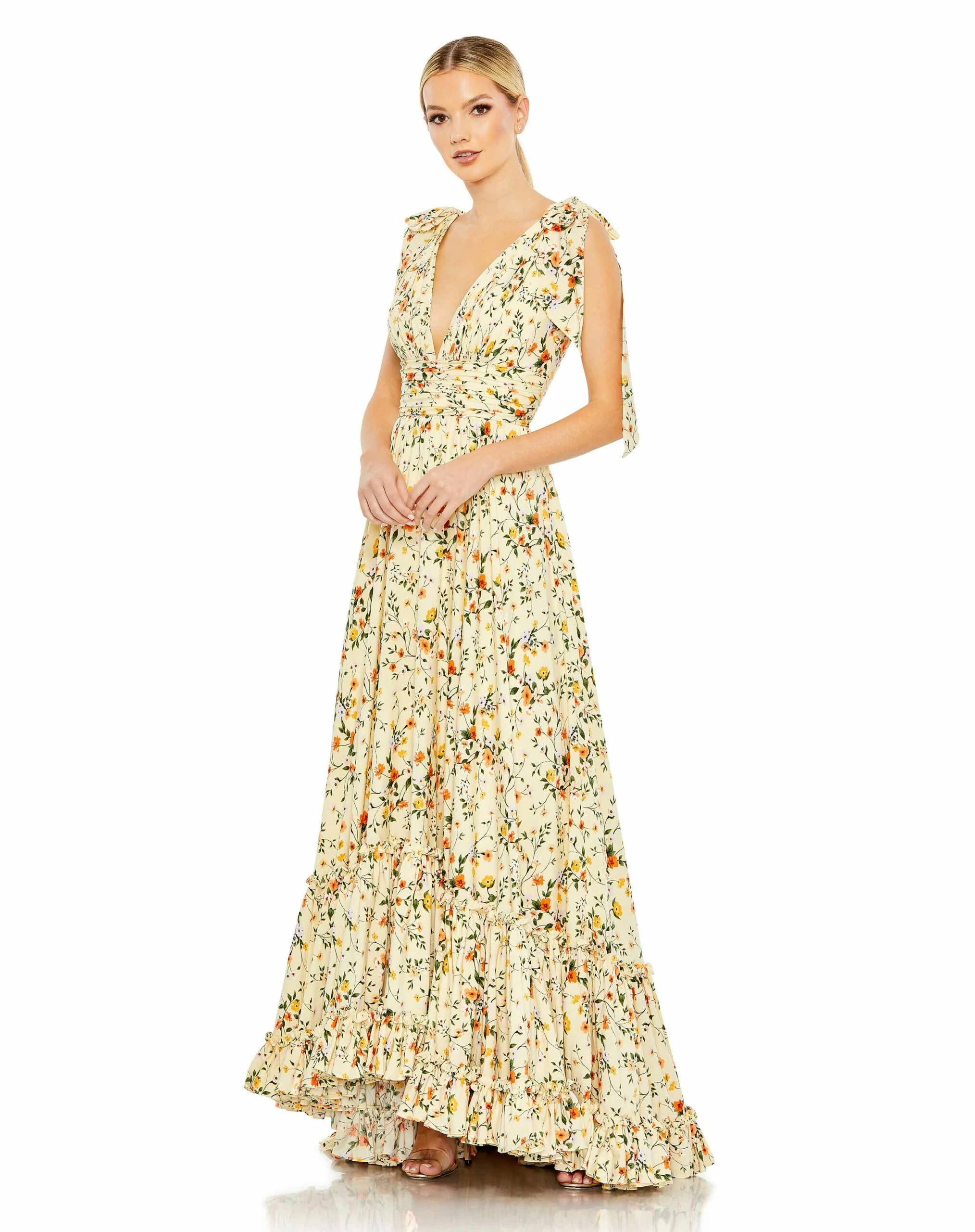Floral Print Soft Tie Sleeveless Tiered Gown