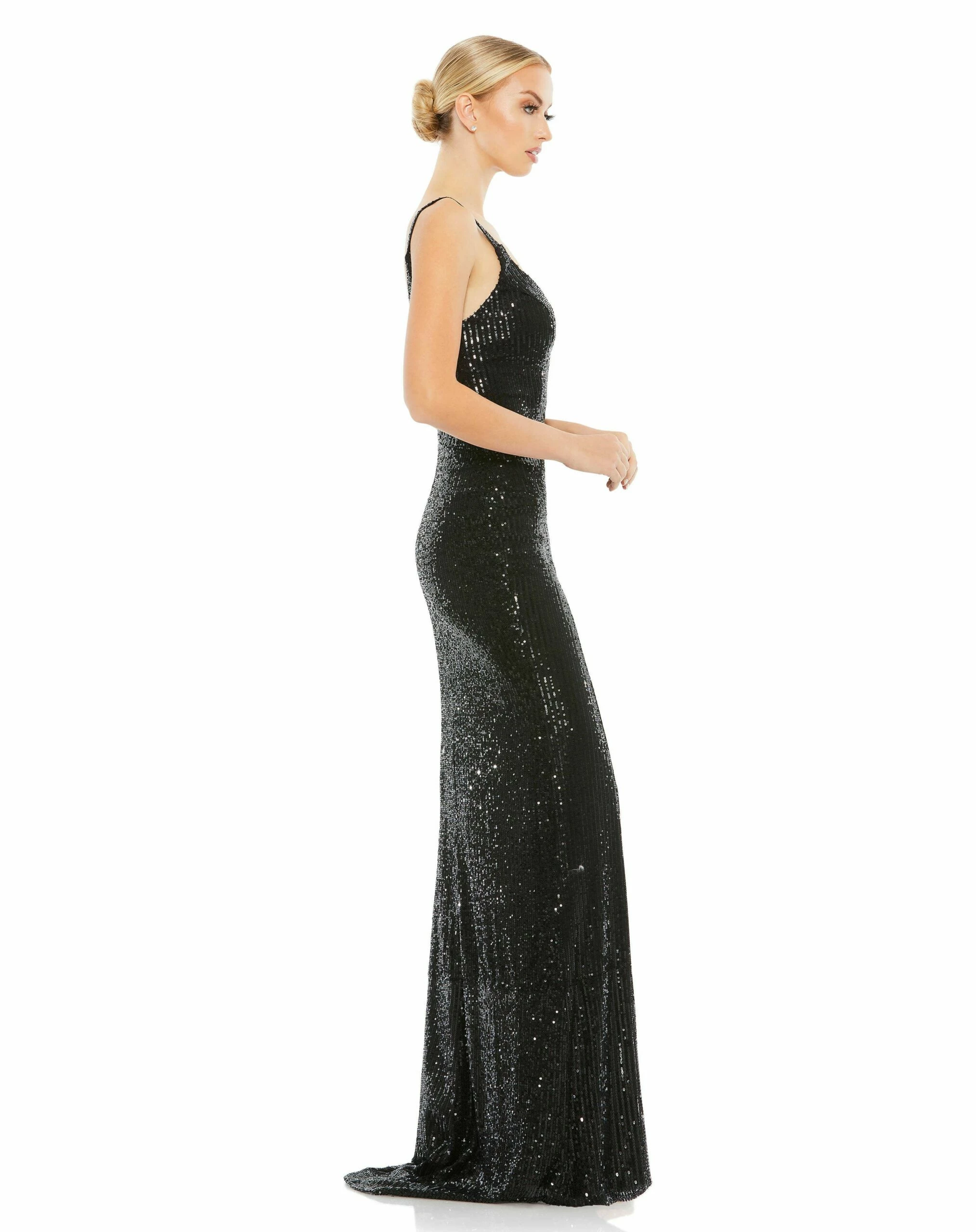 Allover-sequined sleeveless gown with a plunging sweetheart neckline, a low scoop back, and a floor-length skirt featuring a high front slit and delicate sweeping train.