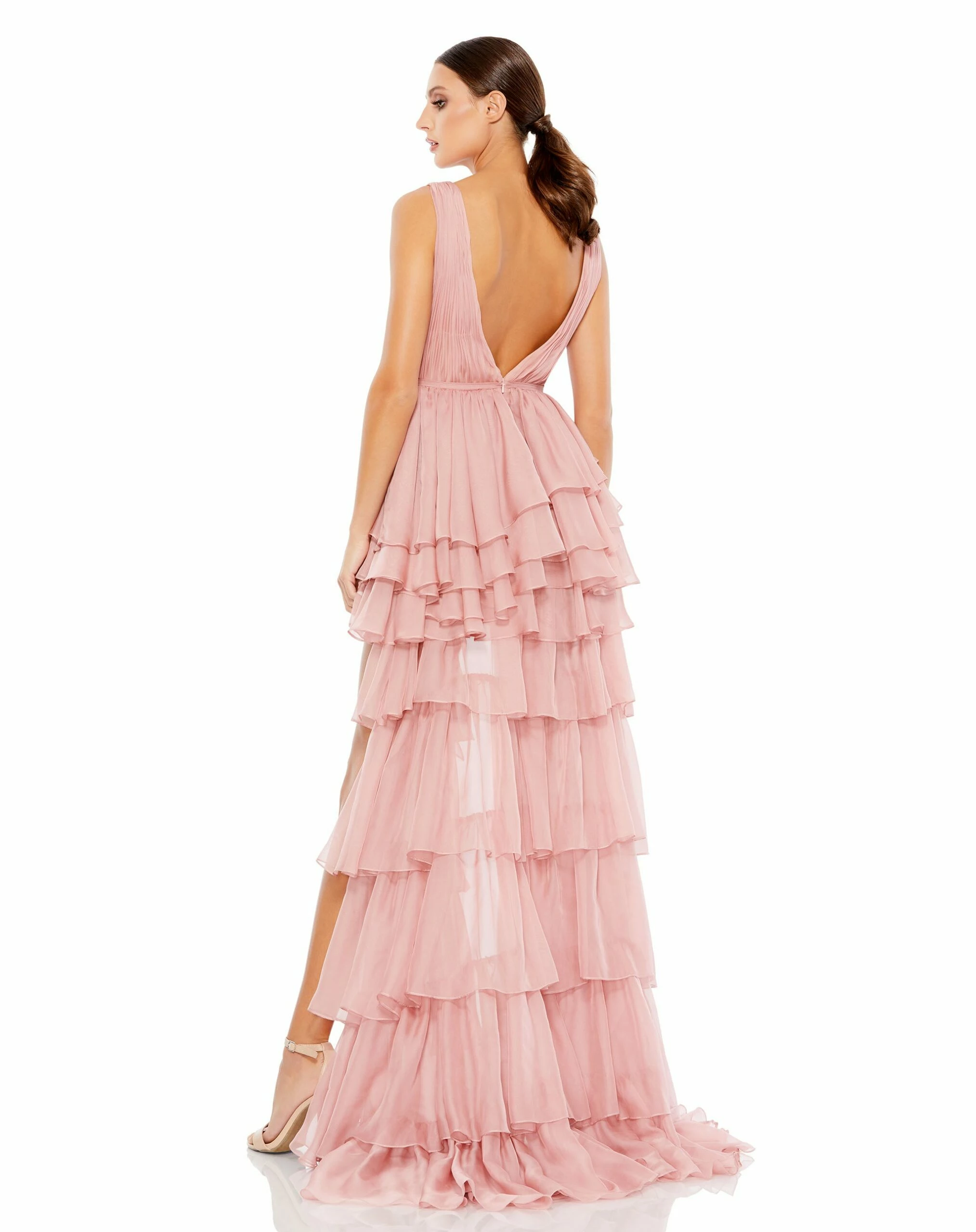 Gorgeous chiffon ruffled high low gown with built-in bodysuit.Â