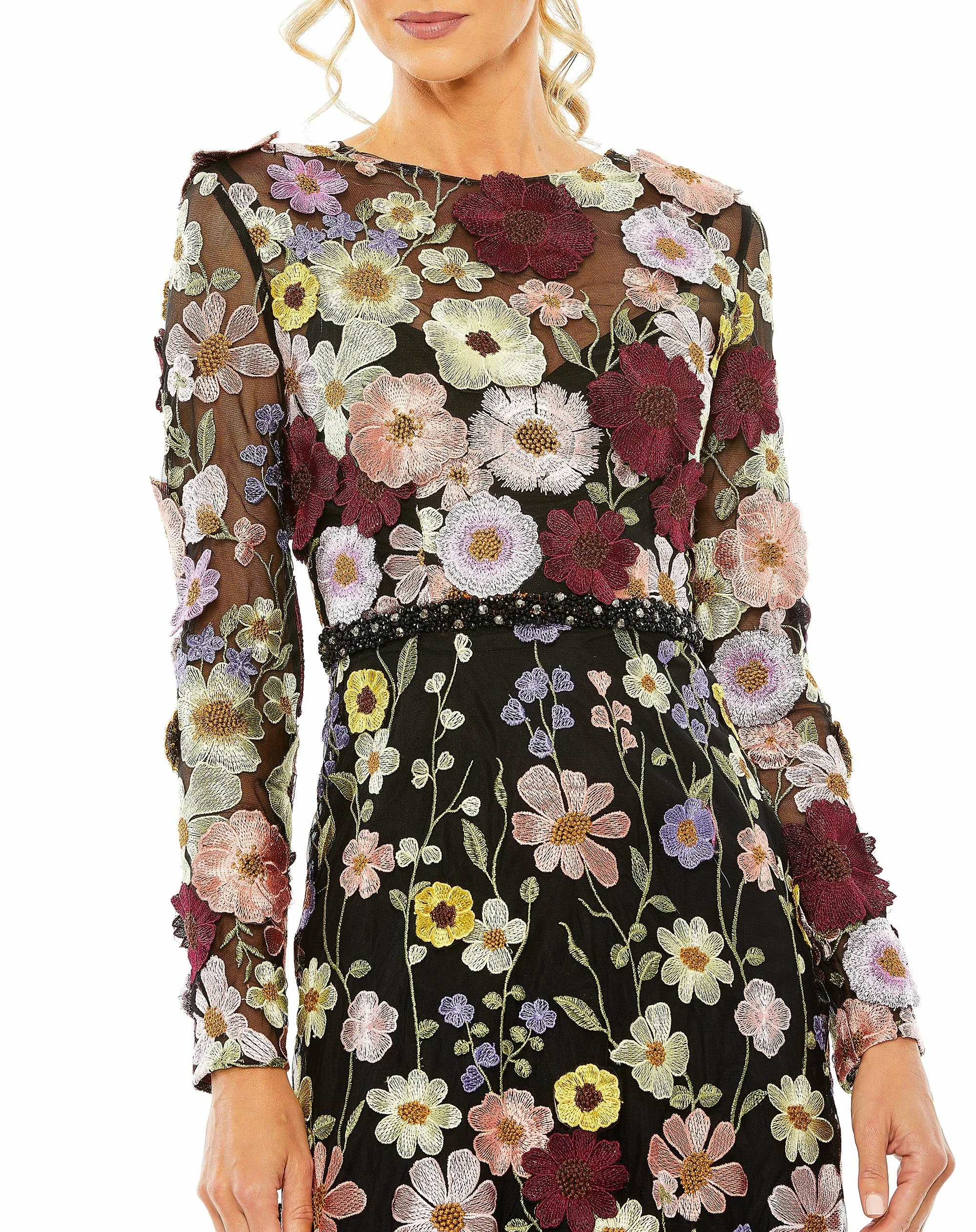 - Sheer floral embroidered overlay; 100% polyester lining