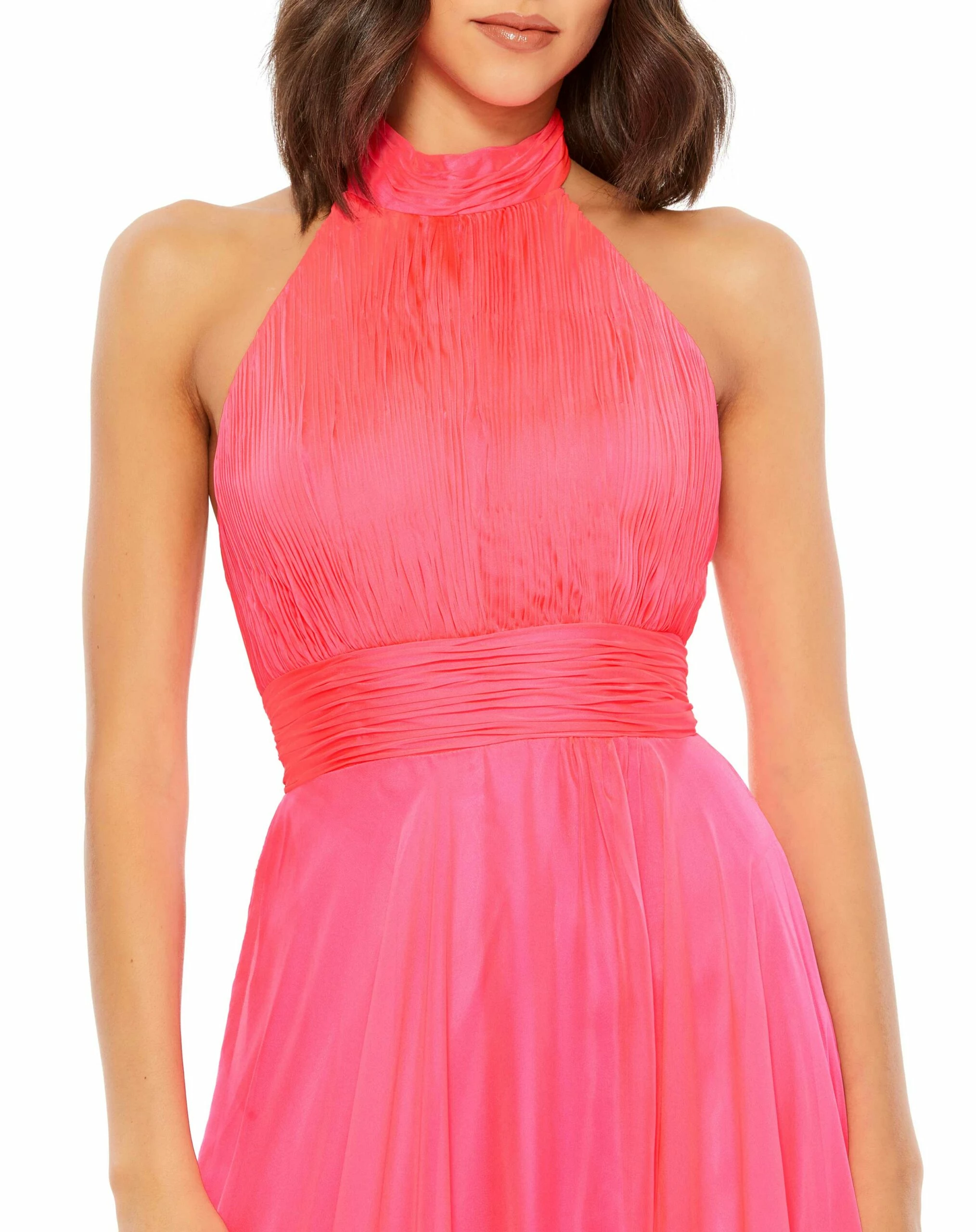 Gorgeous chiffon high-neck halter gown with a ruched bodice, ruched waist, a flowy tiered ruffle hem, and a thigh-high slit,