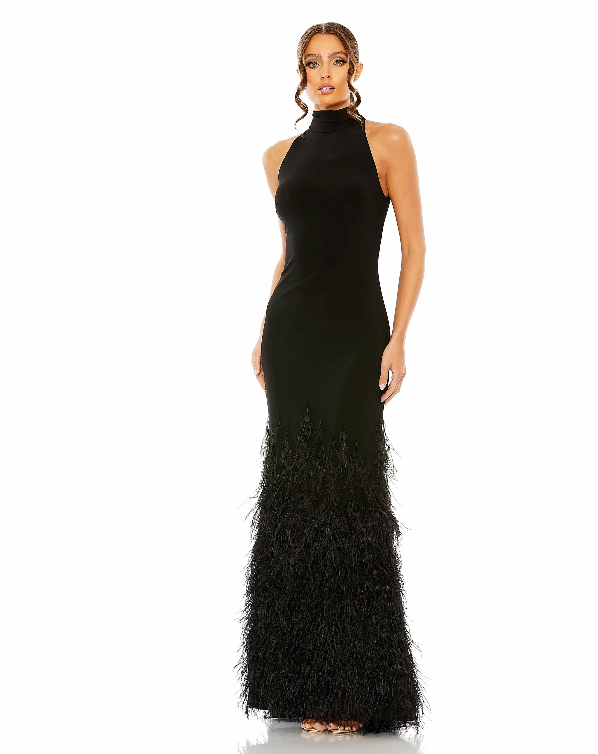 Be the first to review “Jersey Halter Gown With Feather Tiered Detail” Cancel reply