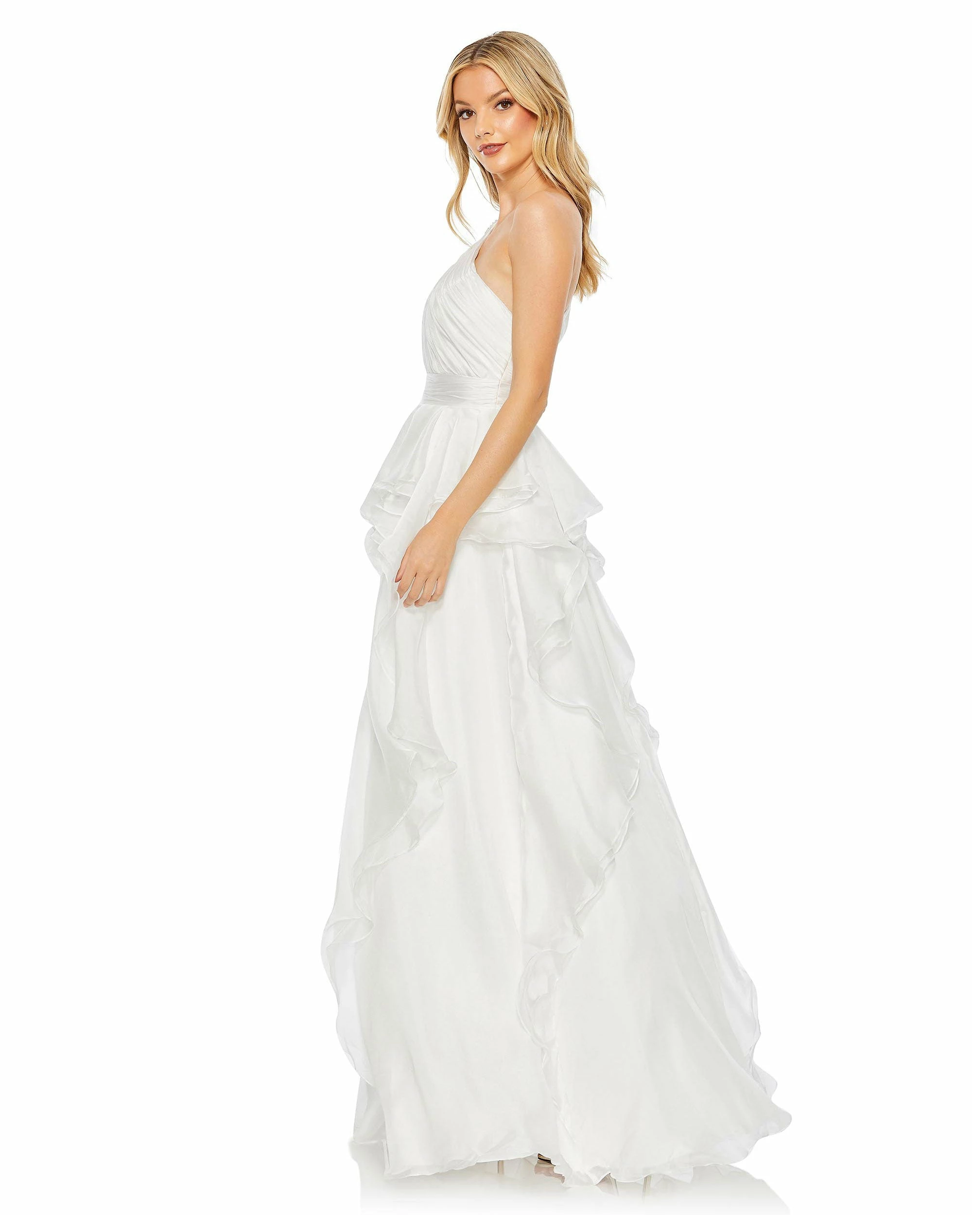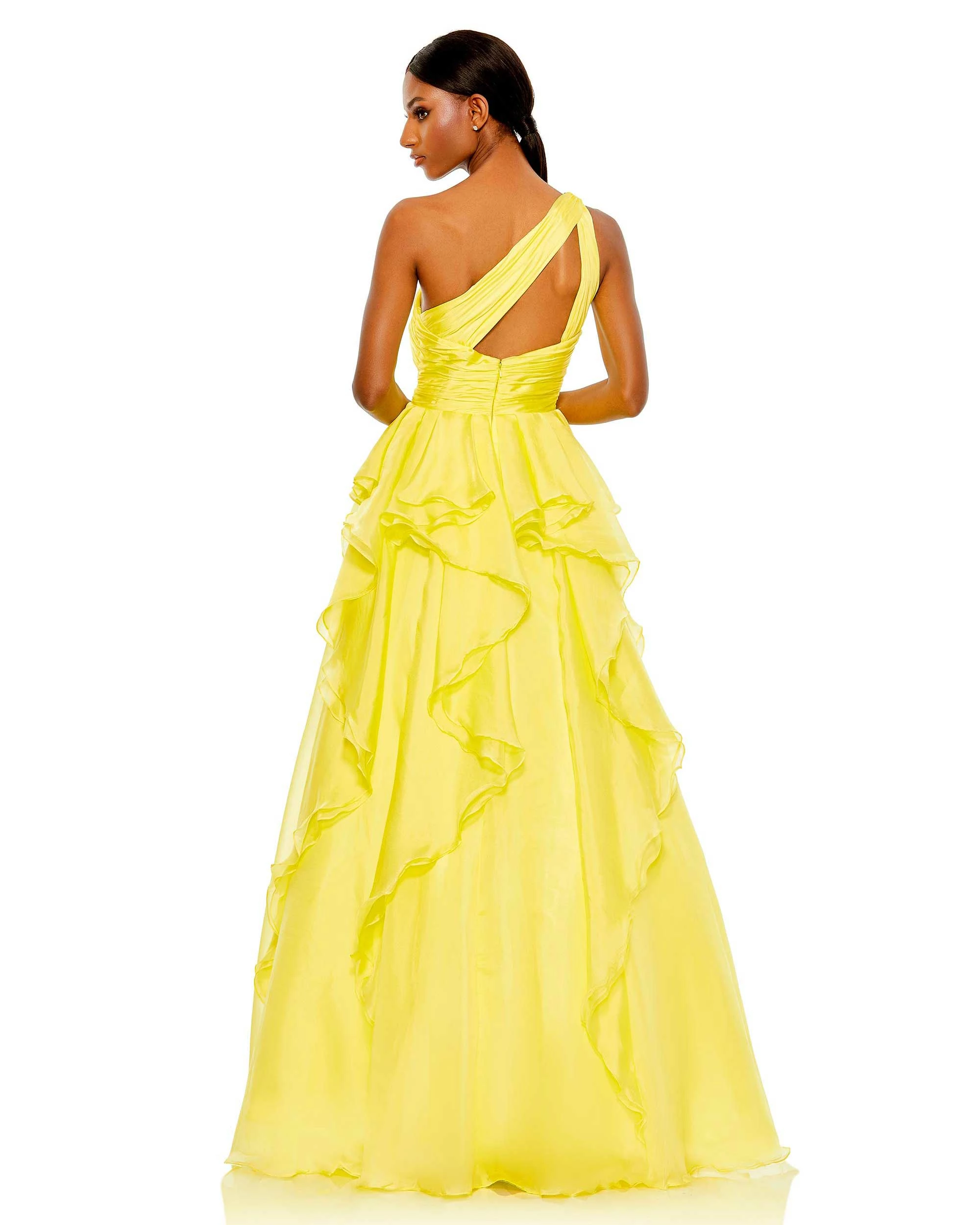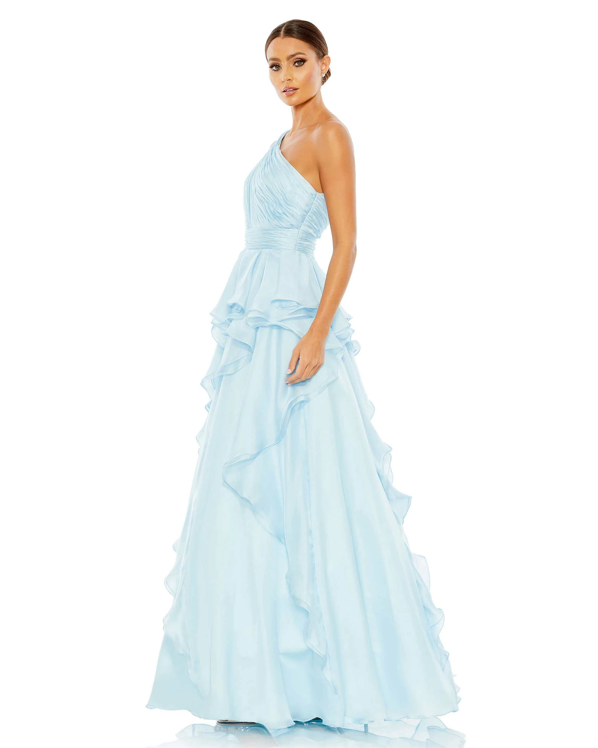 Stylish and glam, the full-skirt gown is designed with a one-shoulder pleated bodice, a jeweled shoulder broach, cascading frills that overlay the organza skirt, and a cool geo cutout at the back.