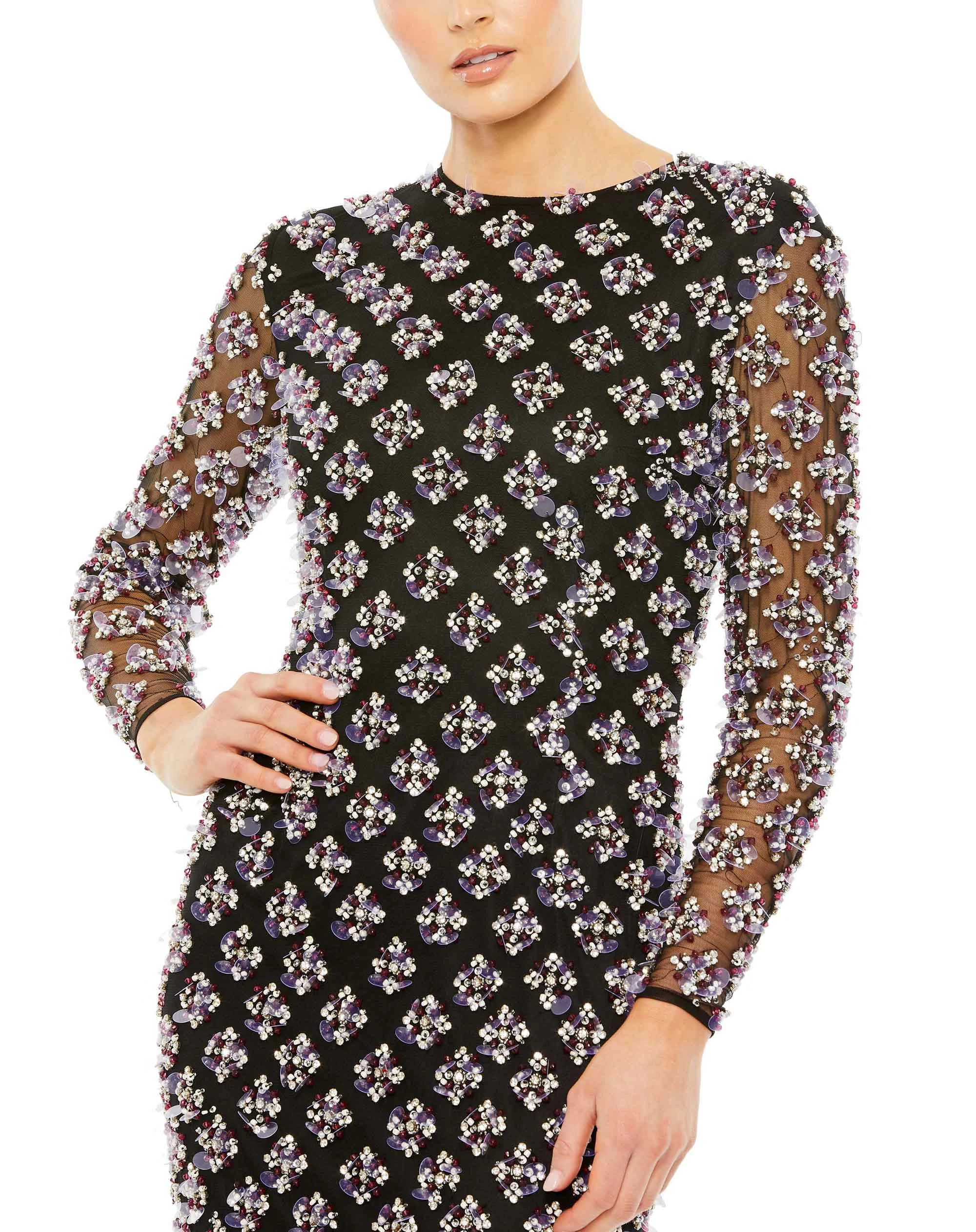 Look and feel luxurious in this Mac Duggal long sleeve gown. The couture quality hand-beaded dress is crafted from 100% polyester mesh fabric with a full body lining and sheer unlined sleeves. A high neckline and all-over intricate pattern compose a sophisticated luxury with hand-stitched sequins, beads, and rhinestone embellishments.Â