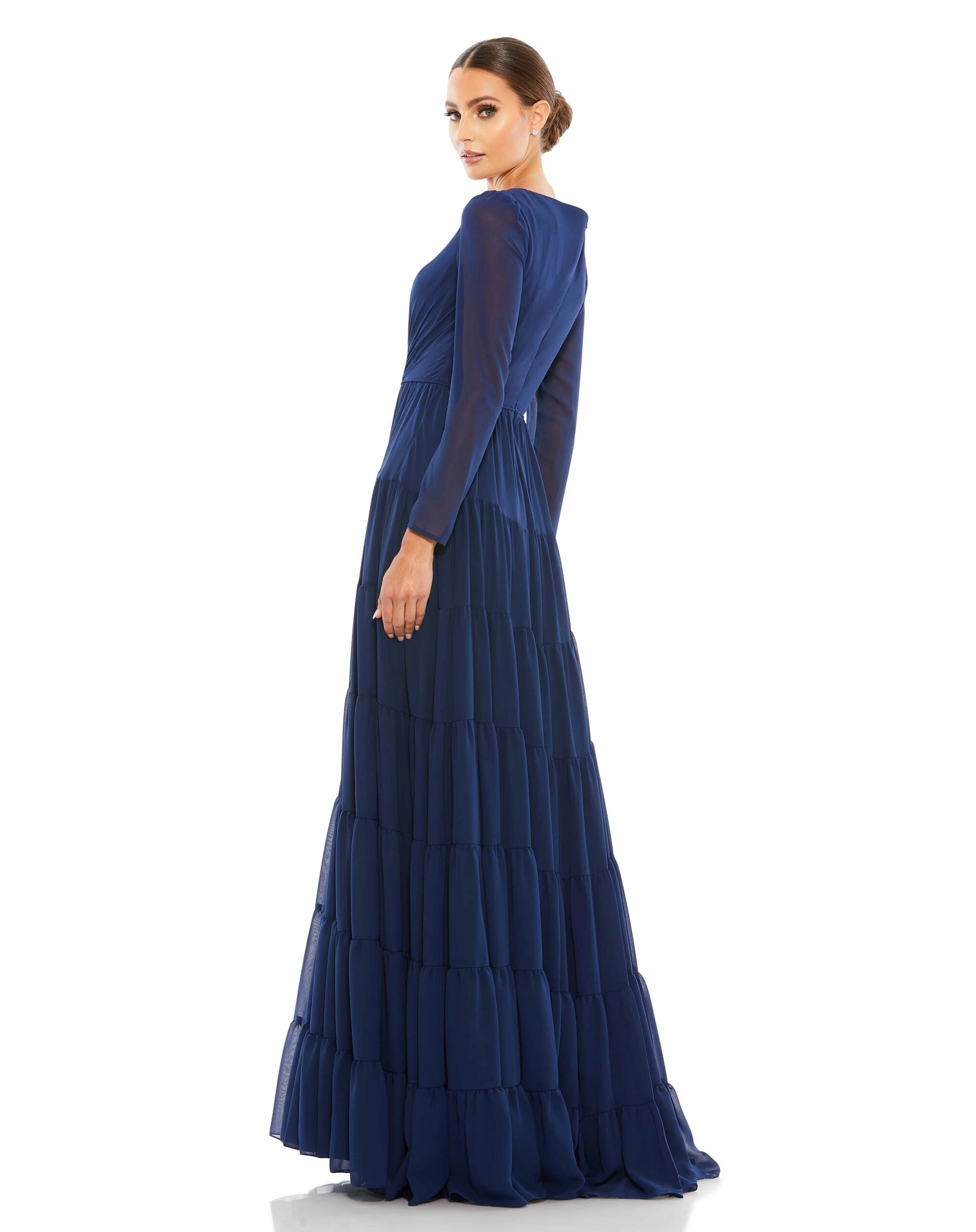 Elegant evening gown with a v-neckline, enchanting long-sleeves, and a tiered flowy ruffle skirt.