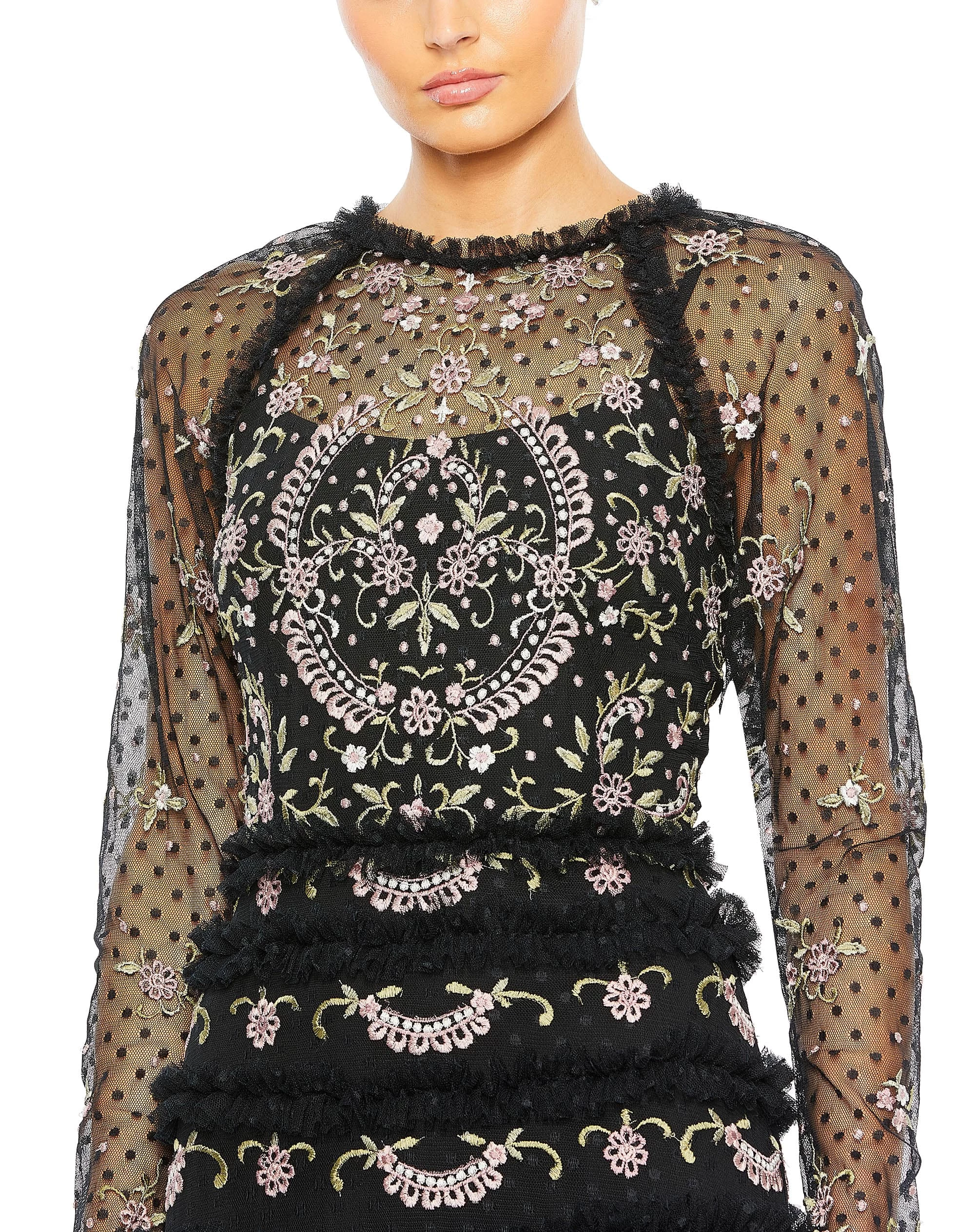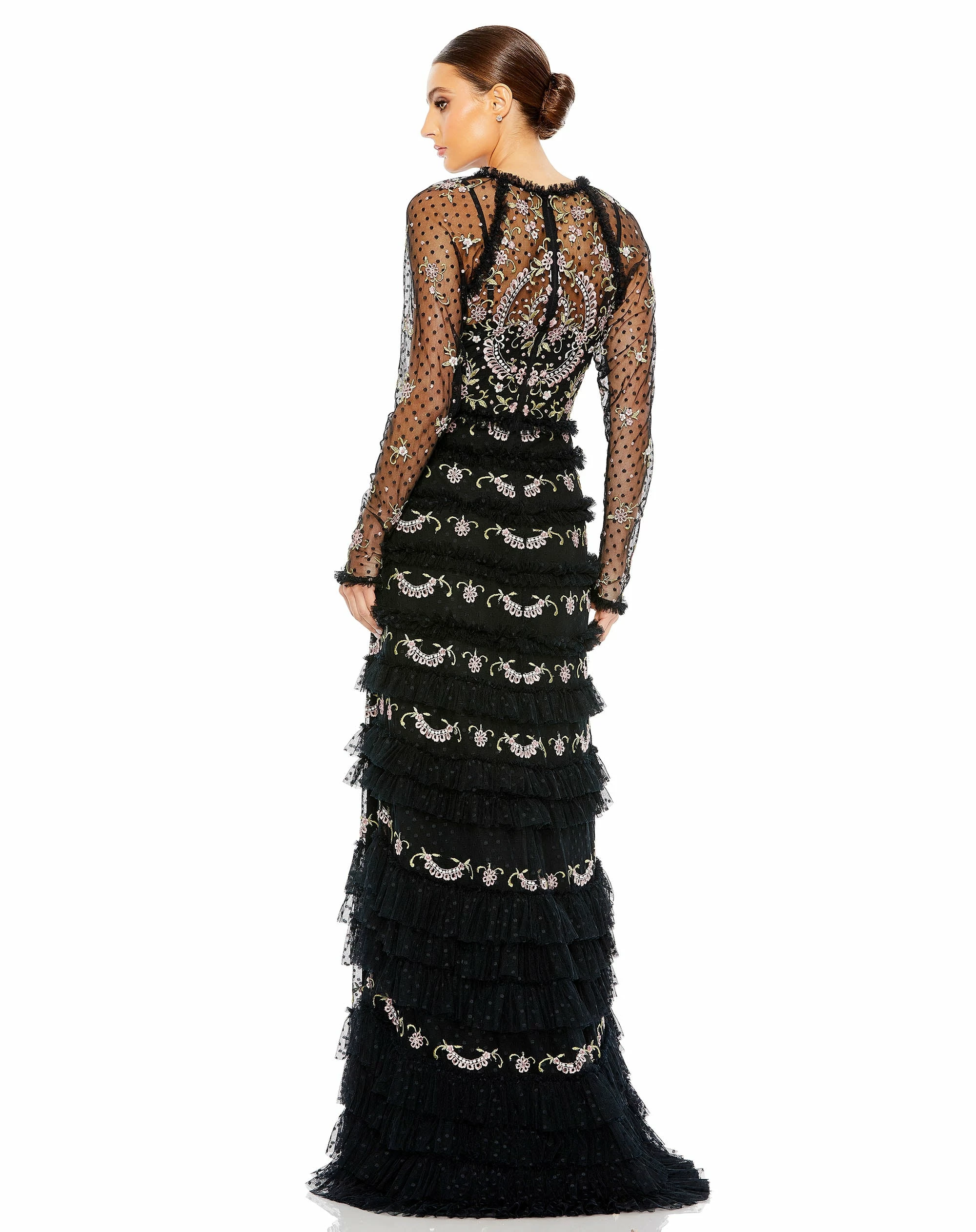 Long Sleeve Swiss Dot Embroidered Floral Ruffle Tiered Gown