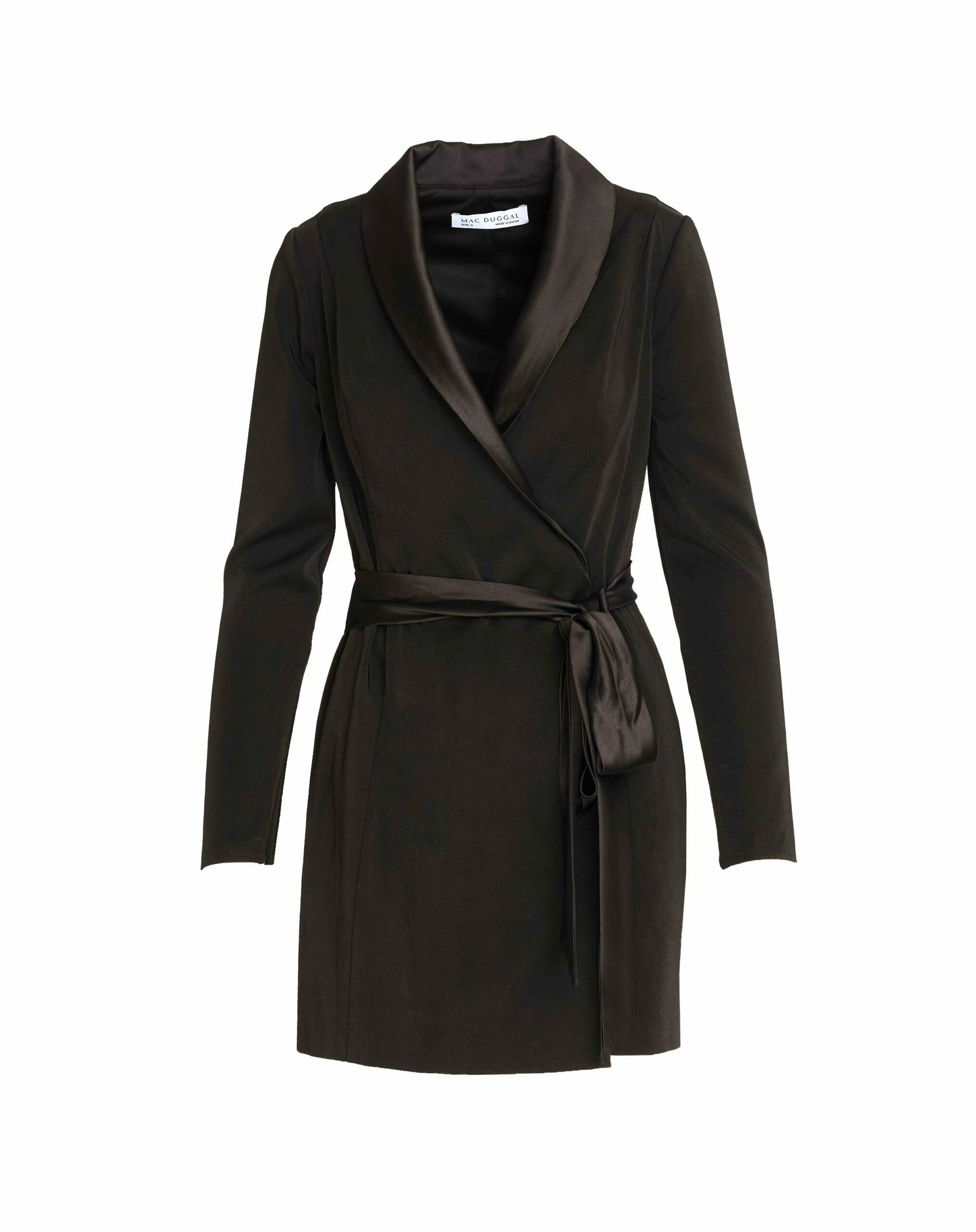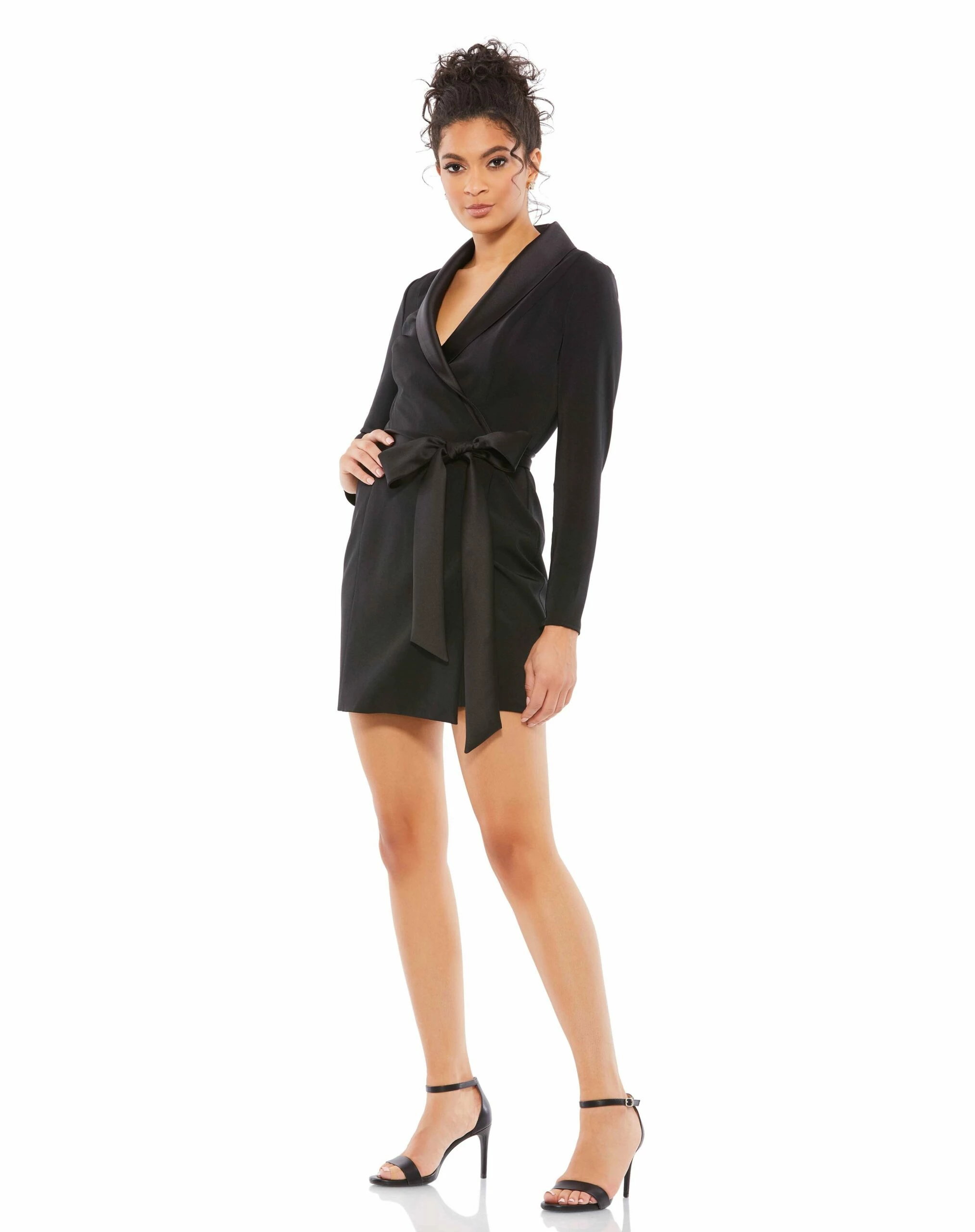 Weāre in love with this tuxedo-inspired wrap dress thatās perfect for parties, holidays, and girlsā night out. The dress is cut well above the knee to showcase your gams and is styled with a satin shawl lapel and bow belt. Wear yours with glittery tights or bare legs and ankle-strap sandals.