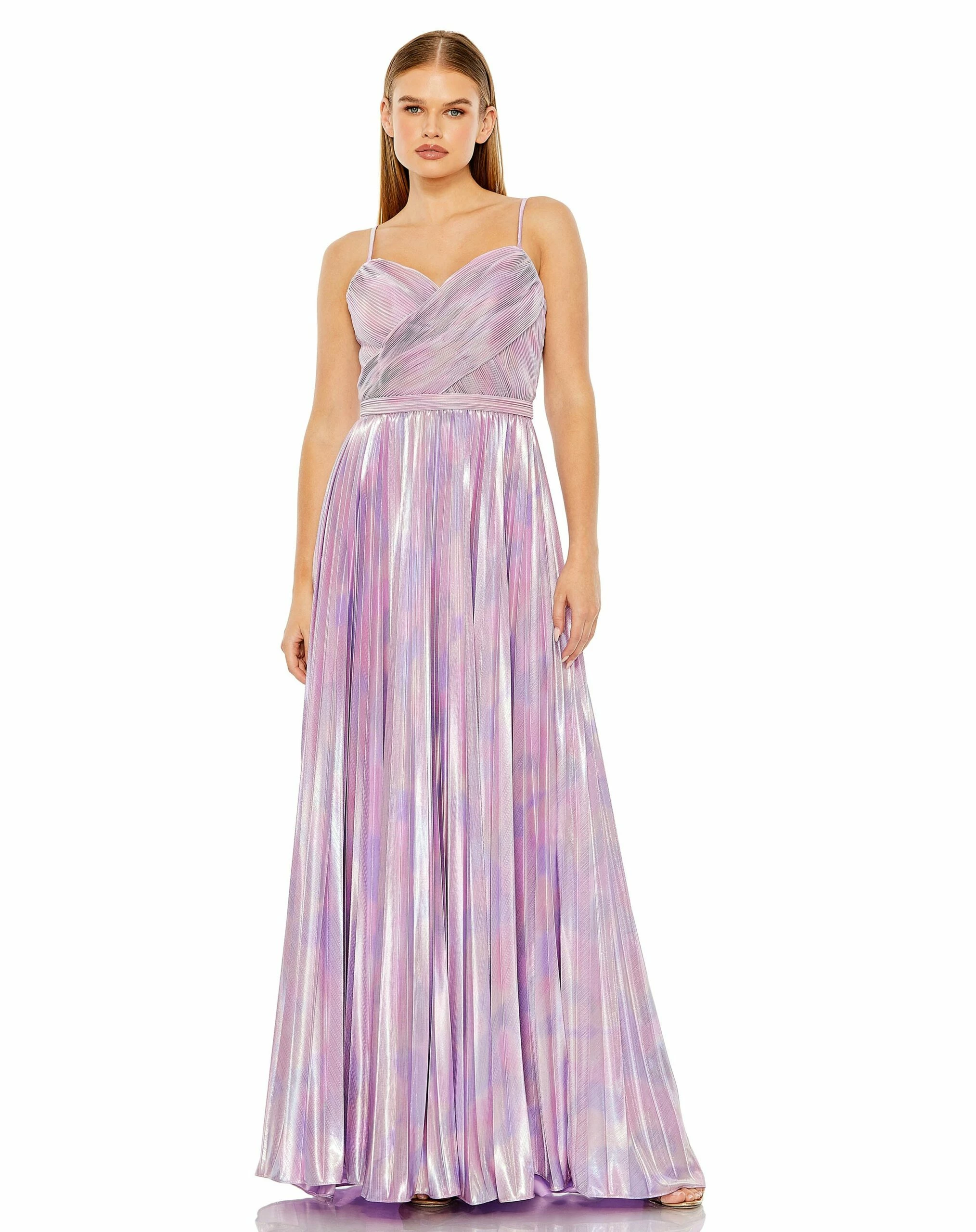 Metallic Slim Strap Deep V Pleated Gown