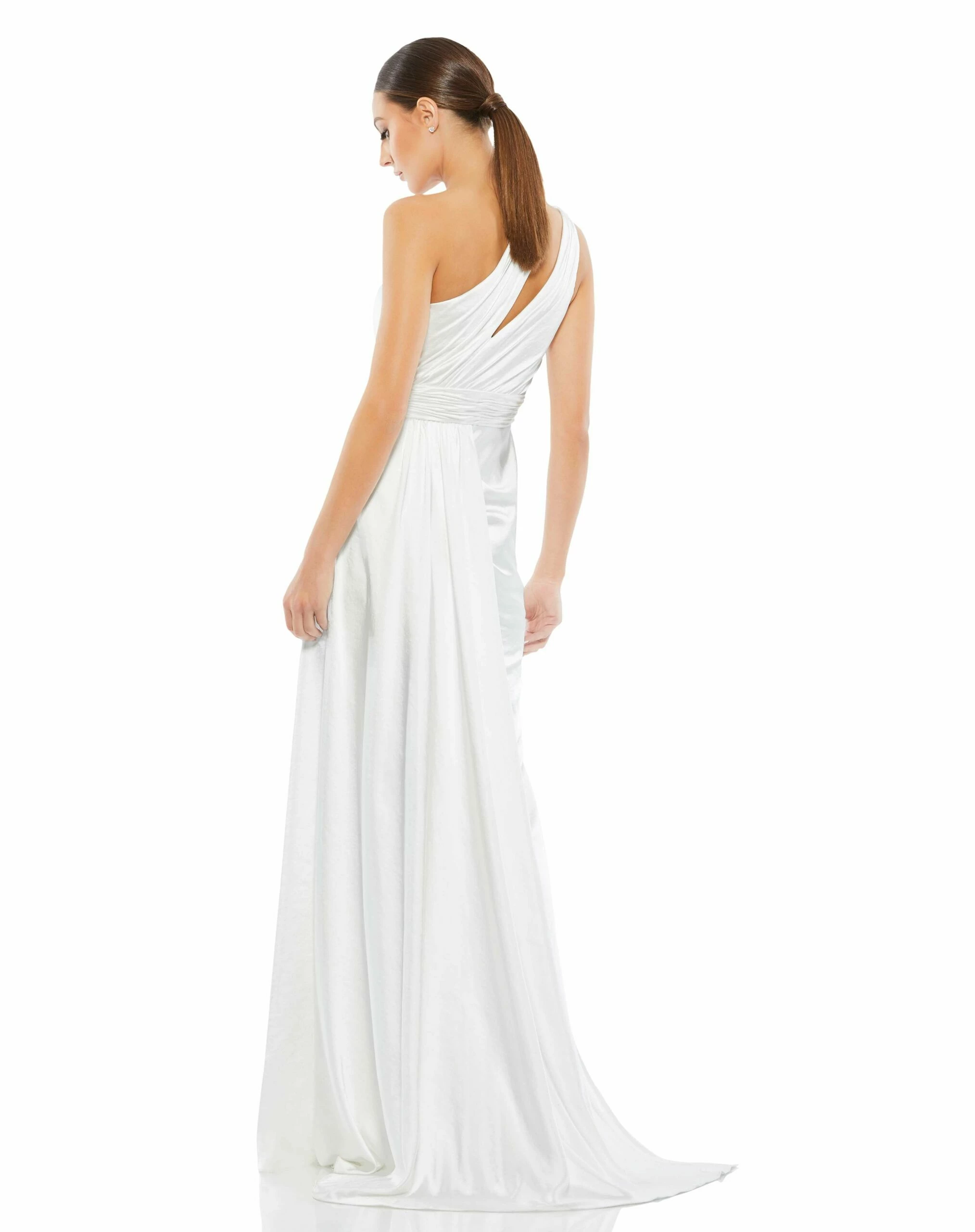 This chic one-shoulder gown has a fitted bodice, cutout at the shoulder, a pleated waistband, and an elegant hi-low skirt.