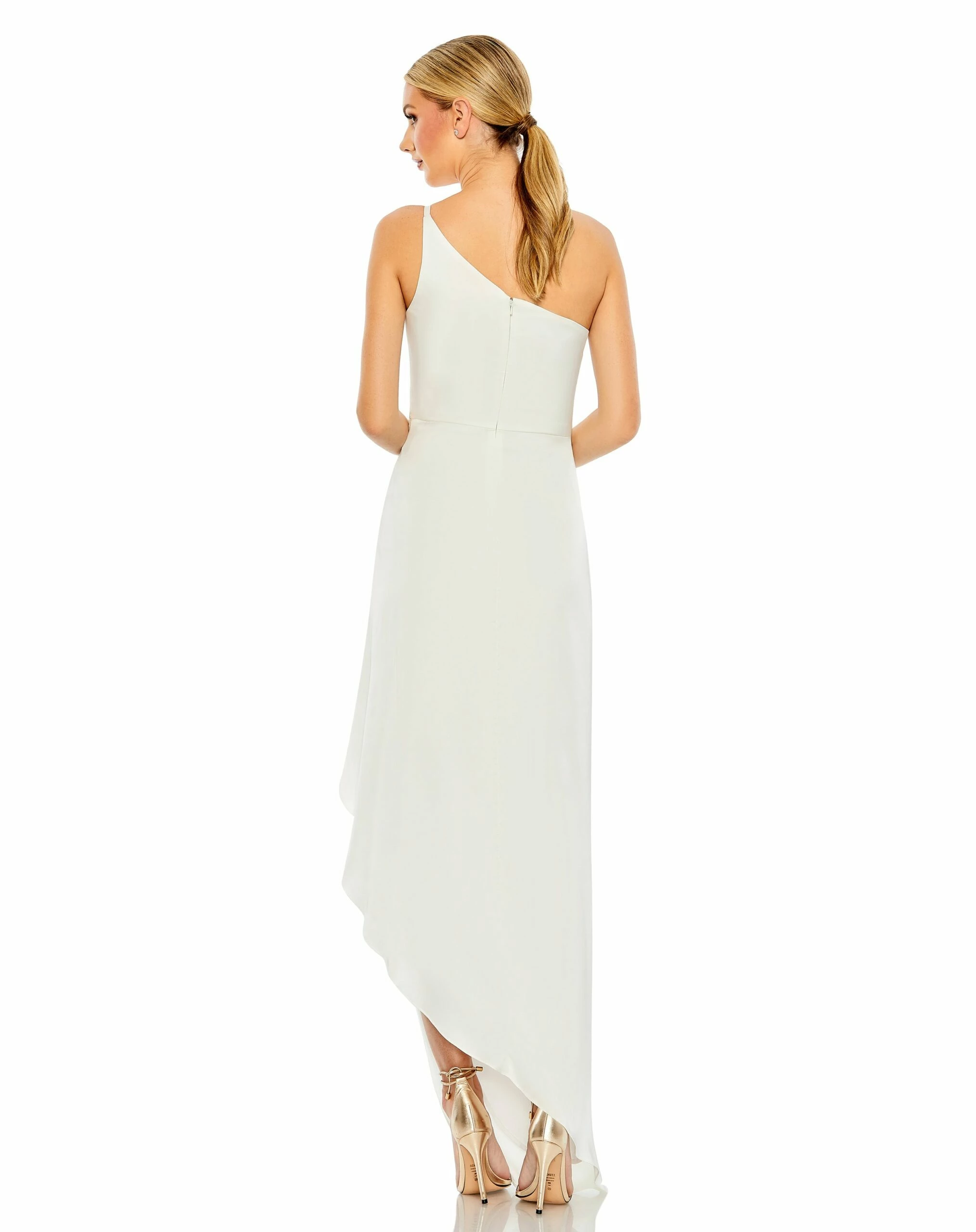 Glamorous one-shoulder draped satin dress with a a hi-low hem and daring slit.