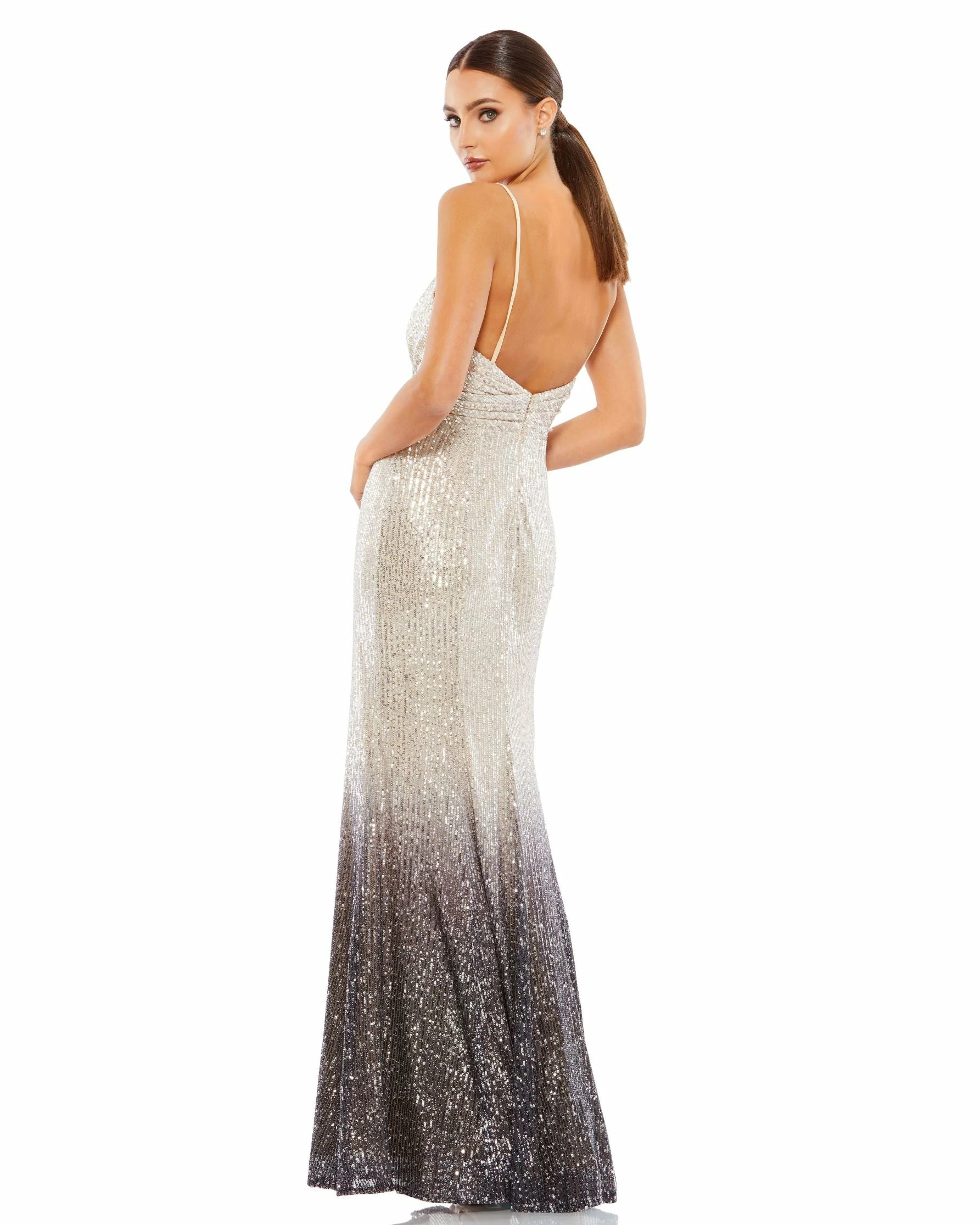 Steal the spotlight in this ombré gown dripping with sequins. The sleek dress is cut with a plunging neckline and styled with delicate, barely-there straps and waist pleating at the front and back that highlights your beautiful figure.