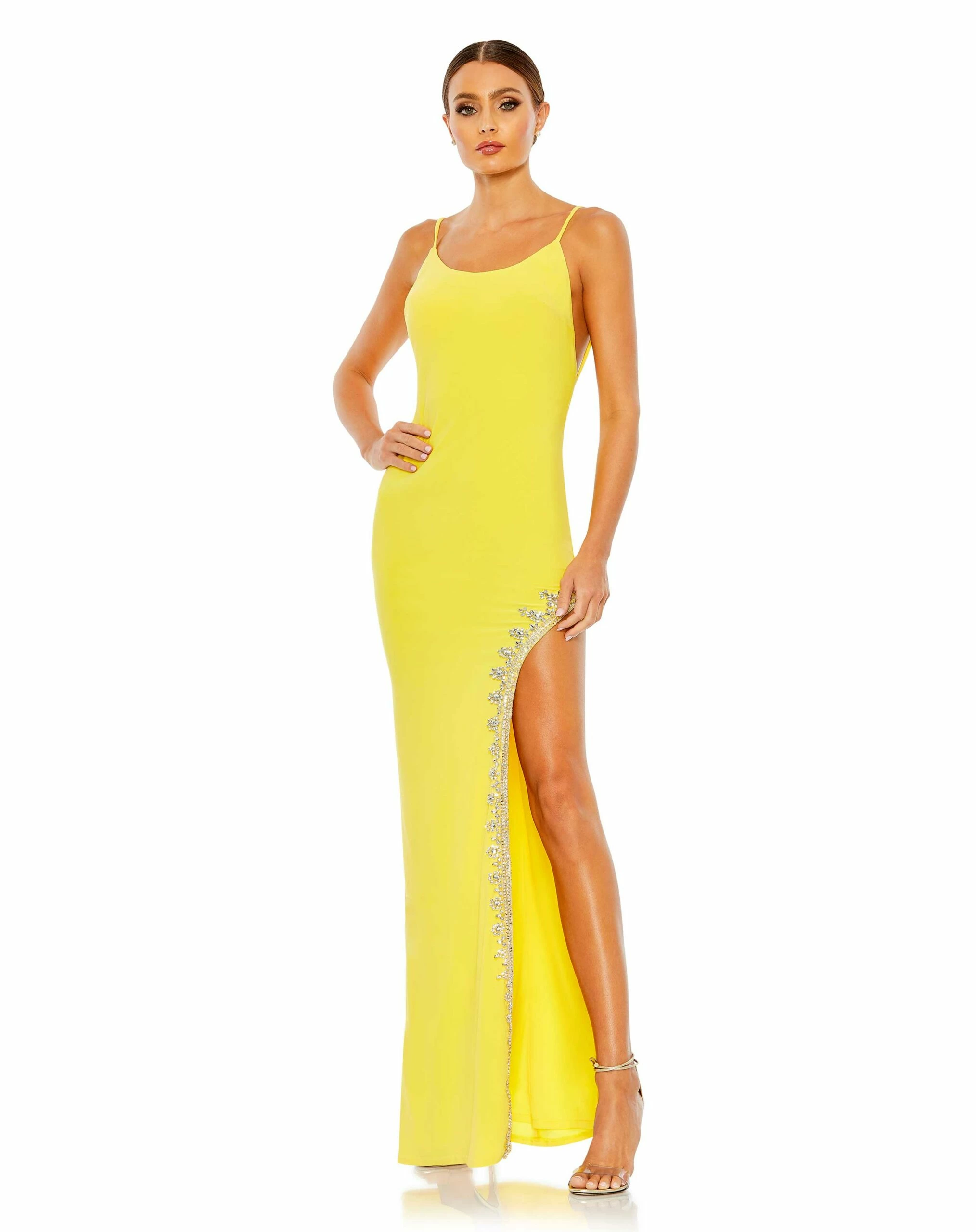 Show off your curves in this sleek and sexy summer dress. Designed with a minimalist spaghetti-strap cut, the full-length dress gets elevated with a wide side slit trimmed by decadent rhinestone accents. An open back delivers the perfect look-at-you finish.