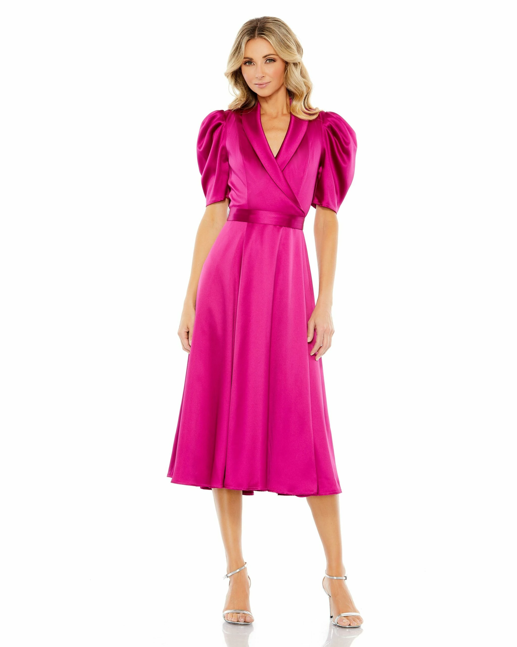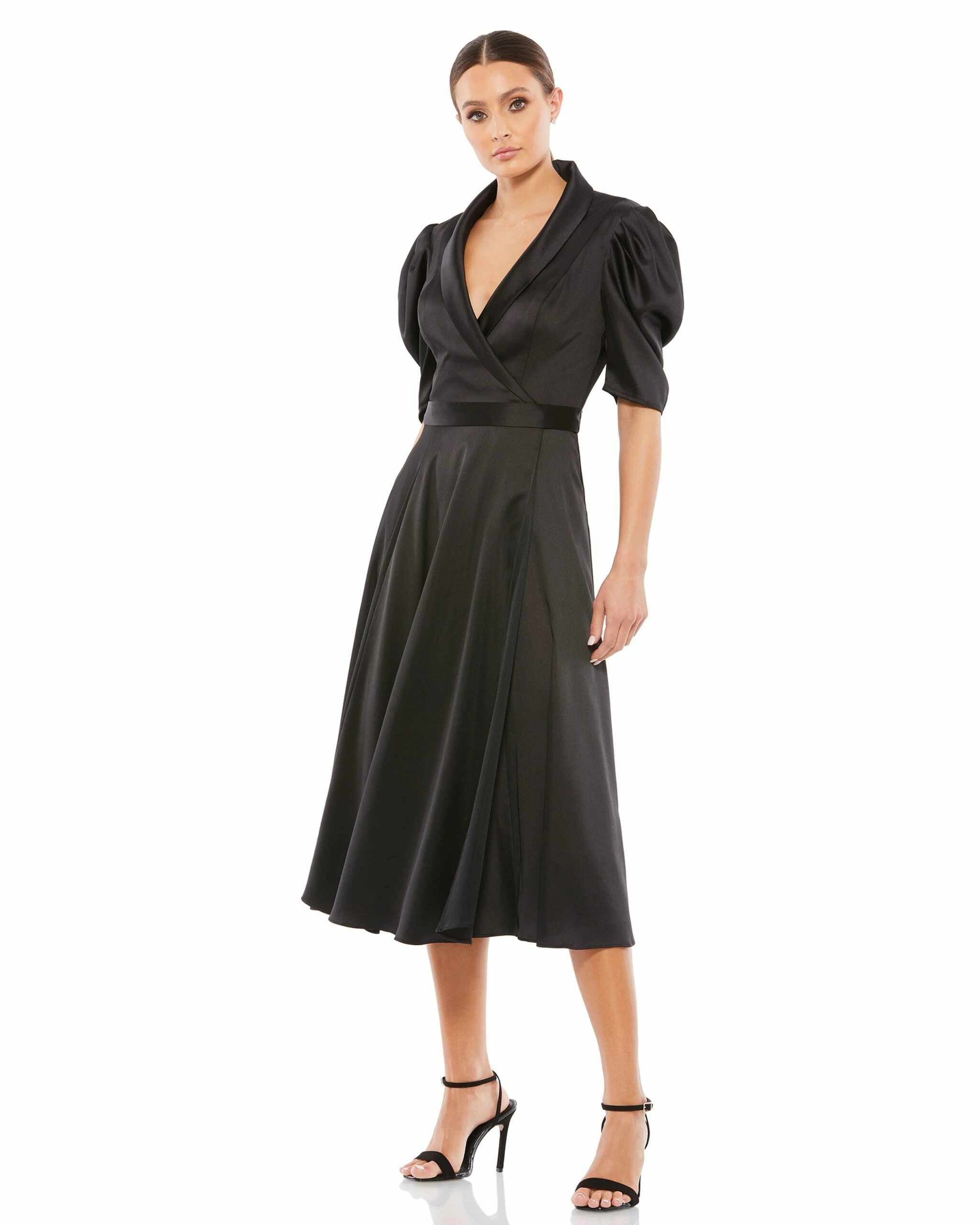 Satin Lapel Puff Sleeve Tea Length Dress