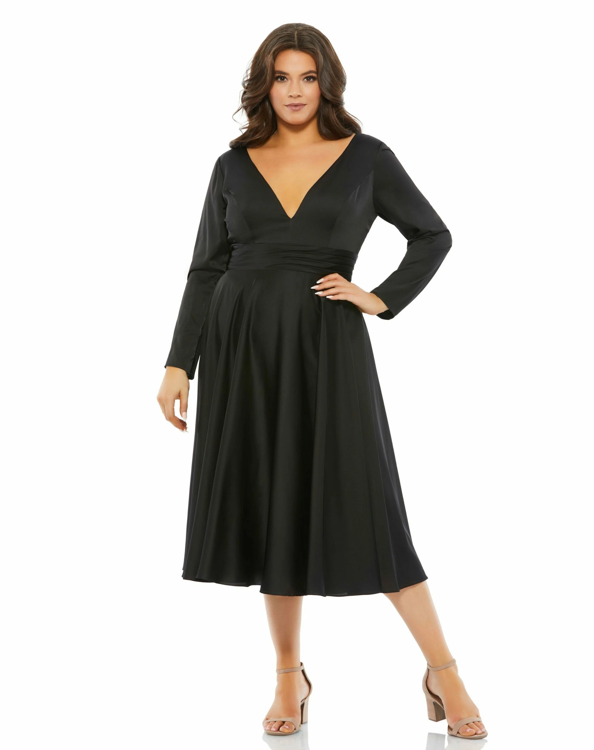 Satin Long Sleeve Sweetheart Flowy Midi Dress (Plus)