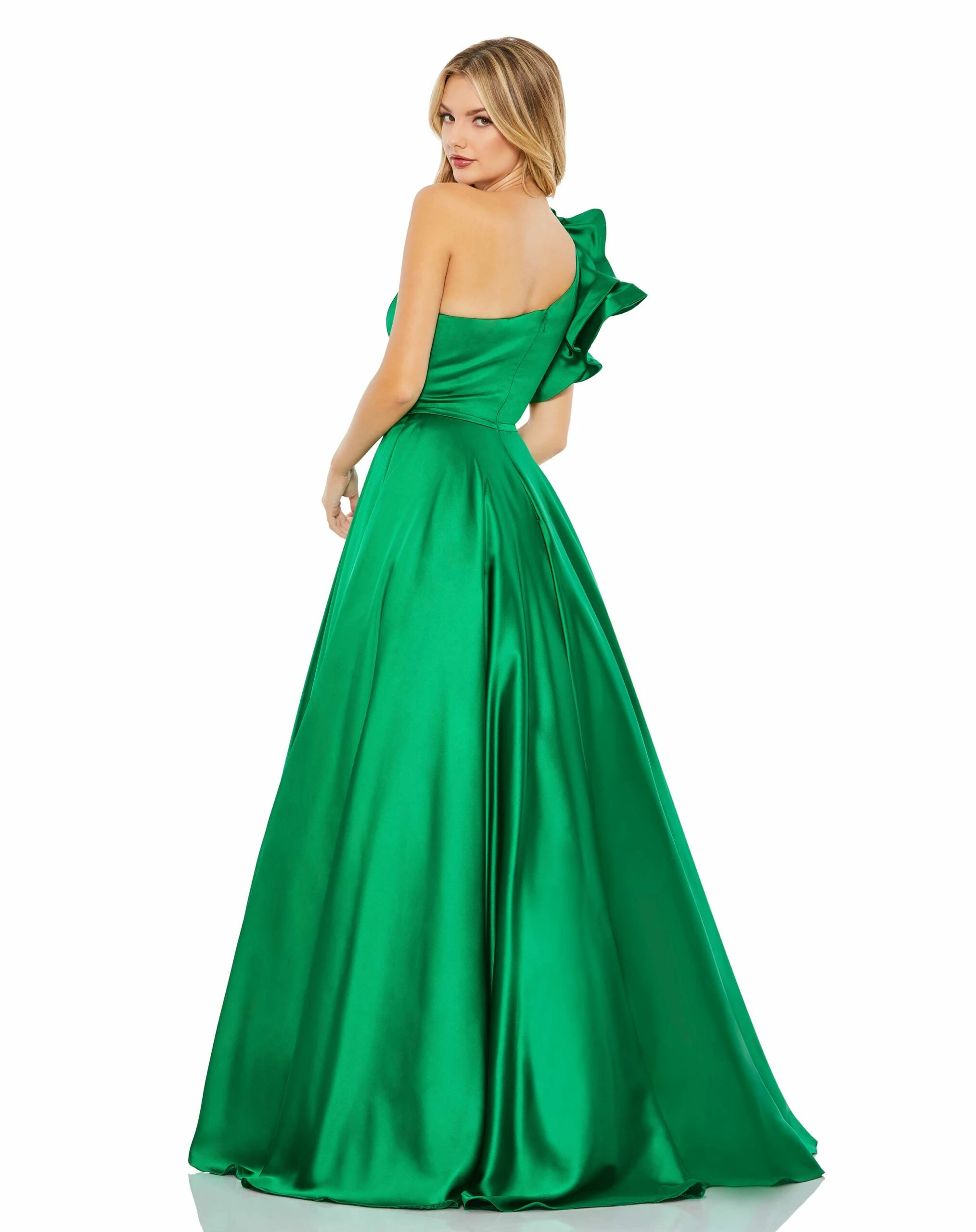 Elegant one-shoulder satin ballgown with an a-line skirt and a dramatic ruffle shoulder