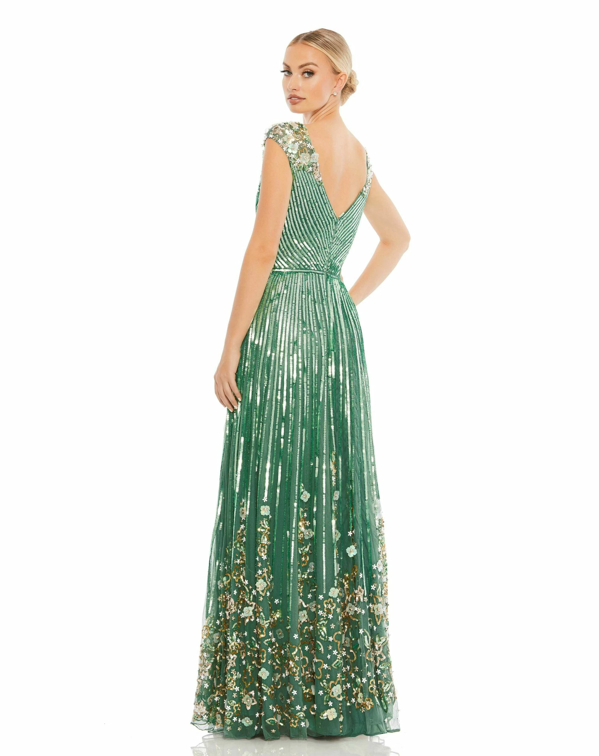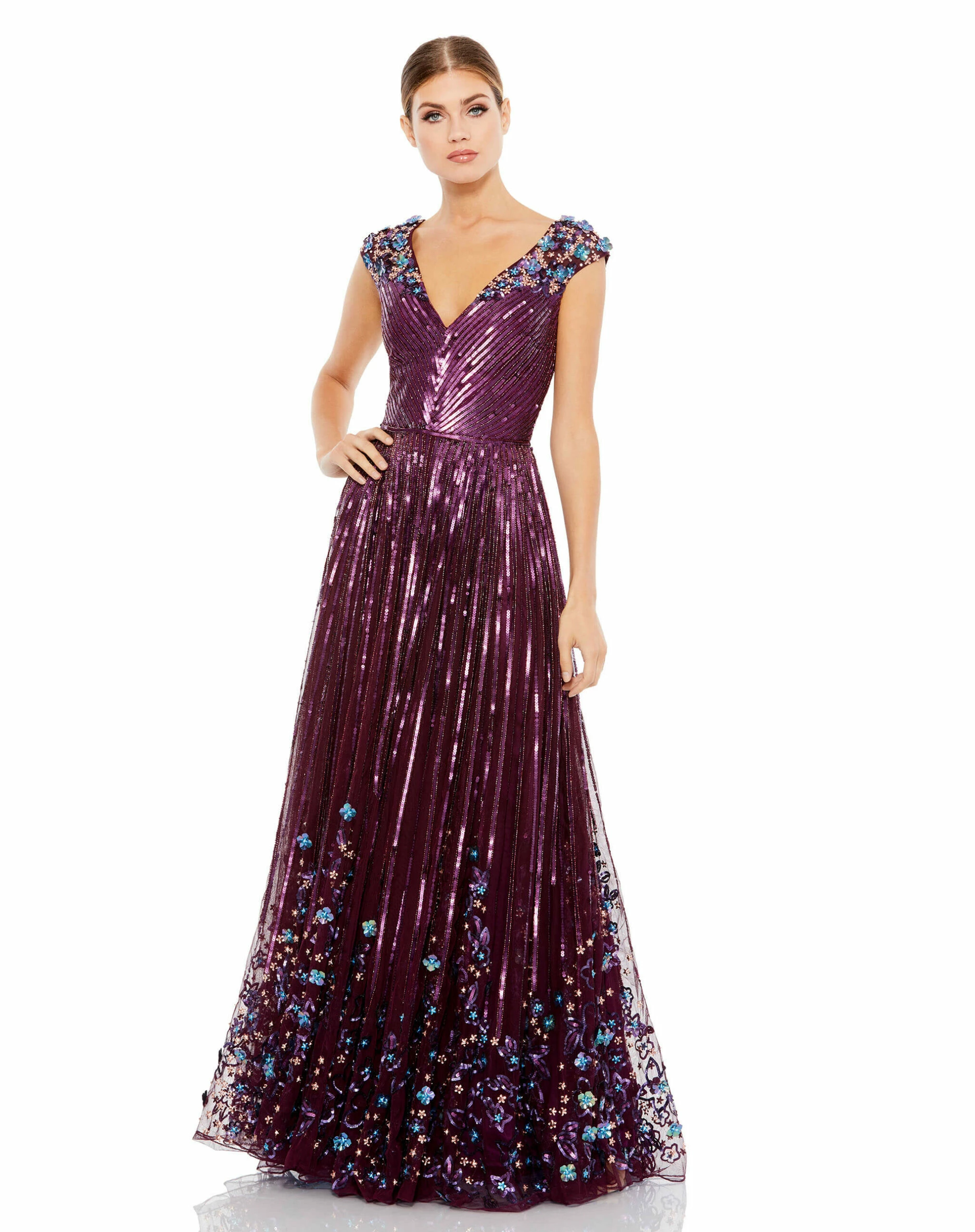 Floor-length evening gown cascading sequin stripes, exquisite 3D floral embellishments at the shoulders and bottom hem, and a sweeping A-line hem.