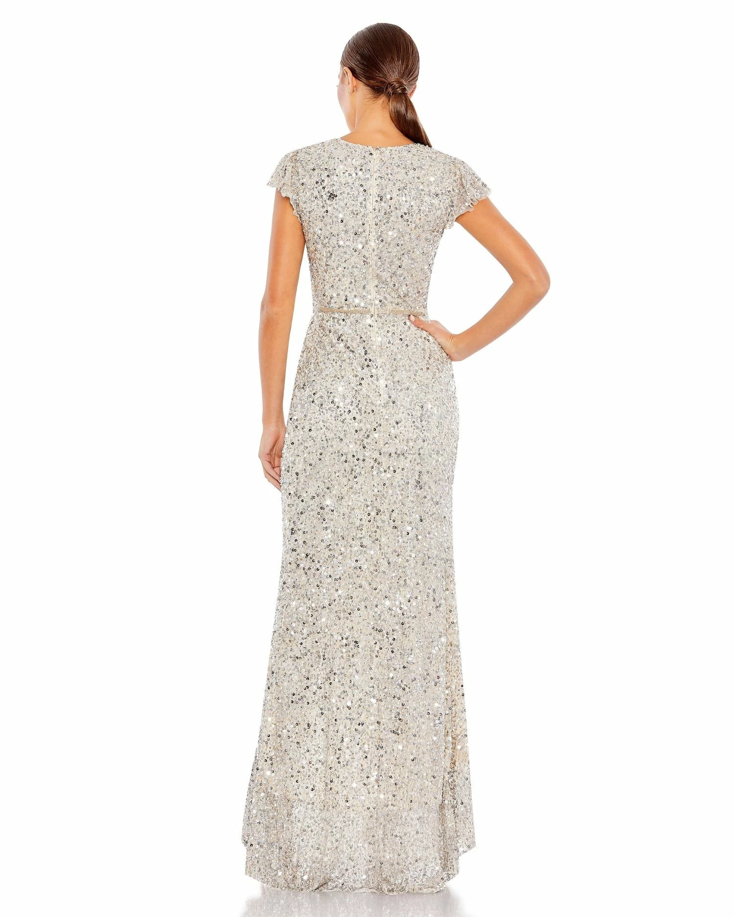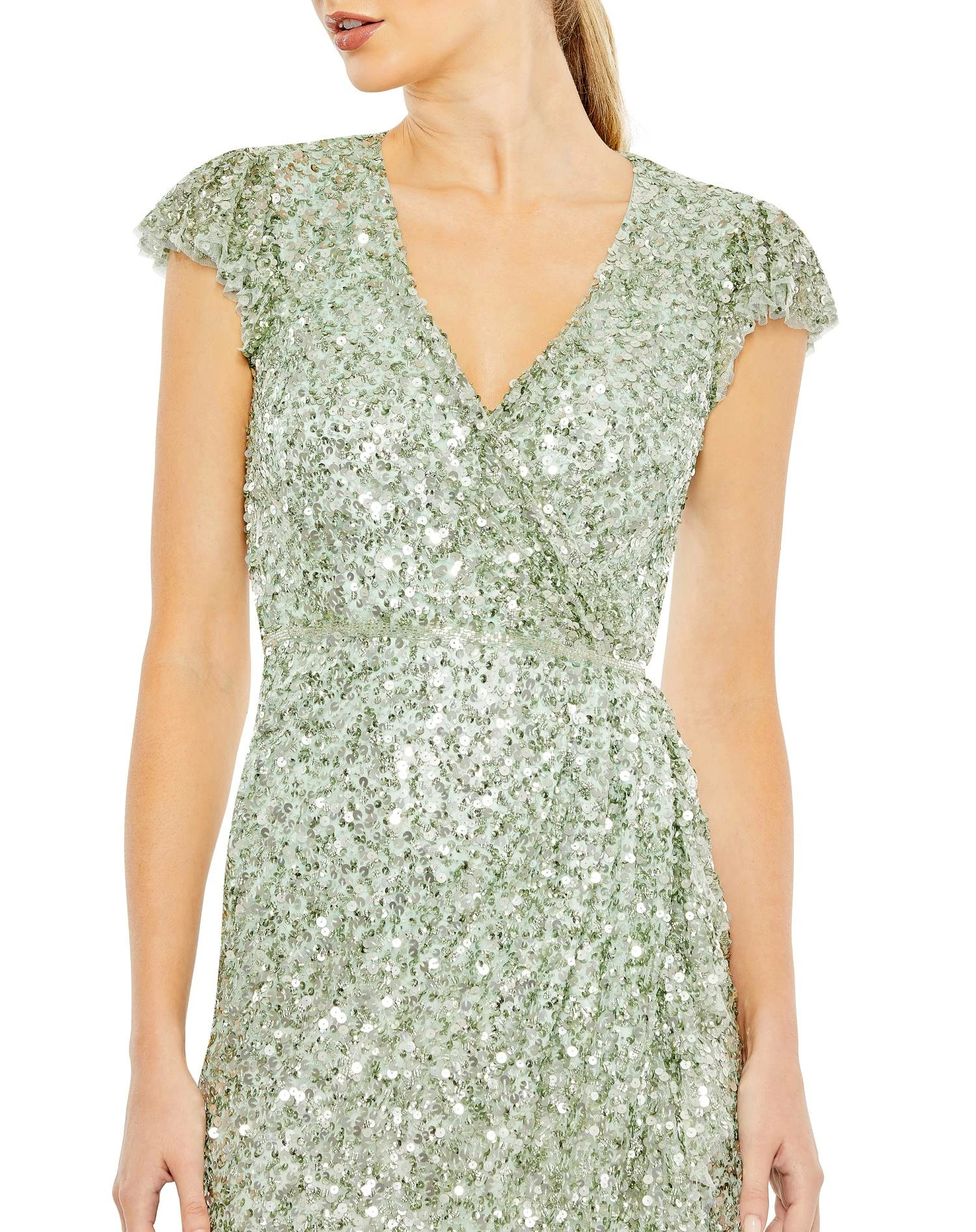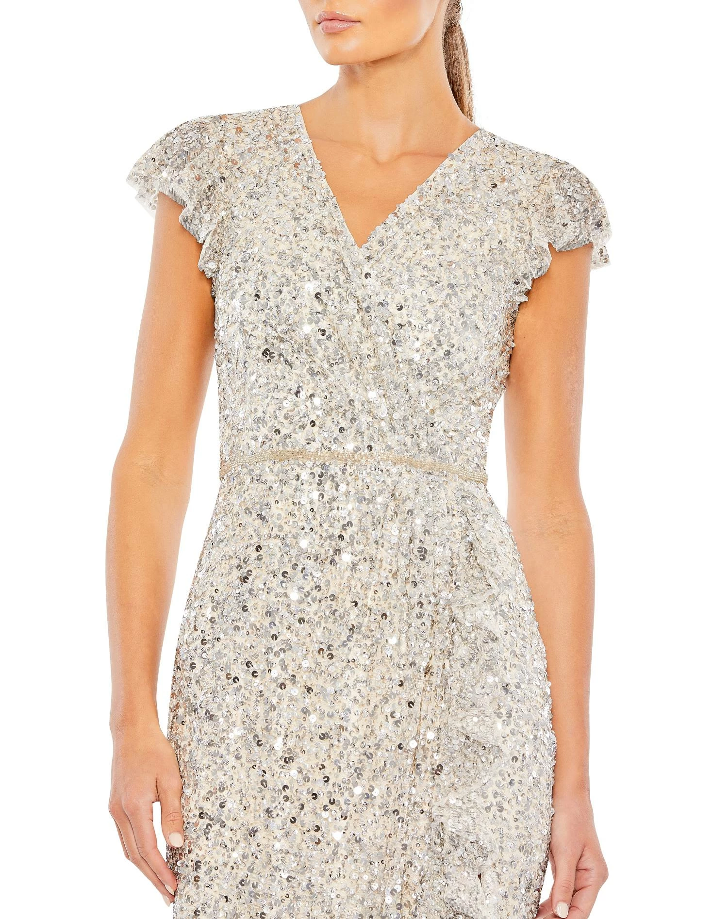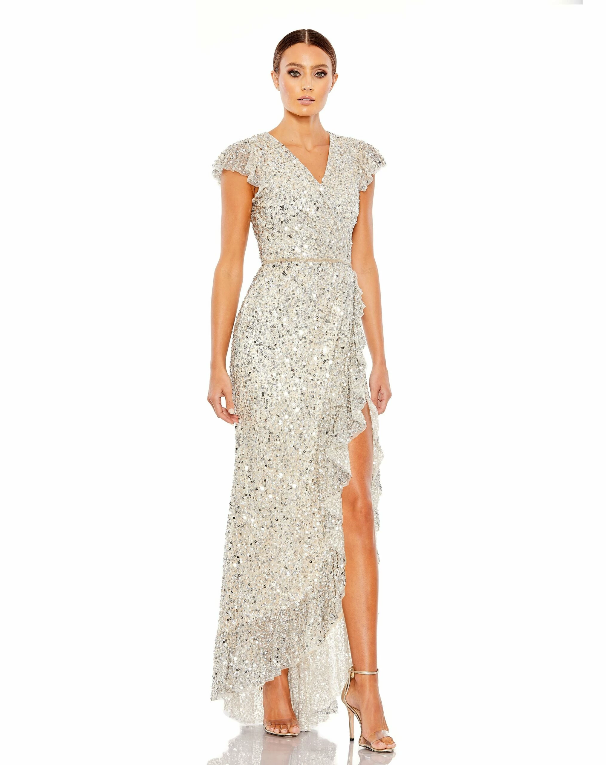 Sequined Faux Wrap Ruffle Cap Sleeve Gown