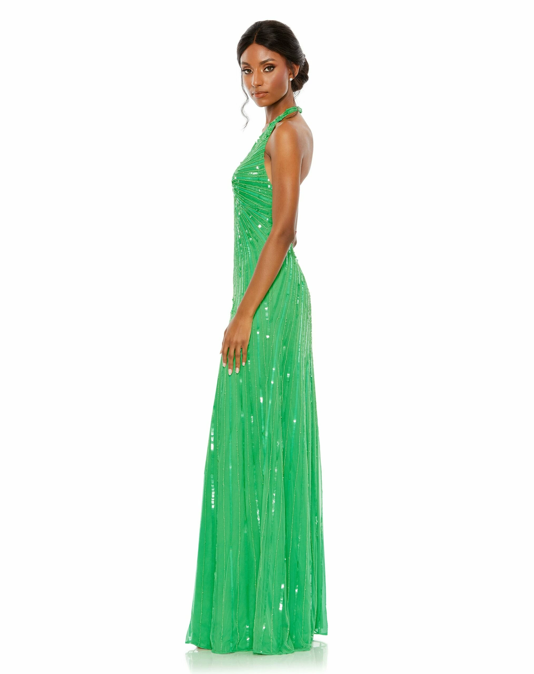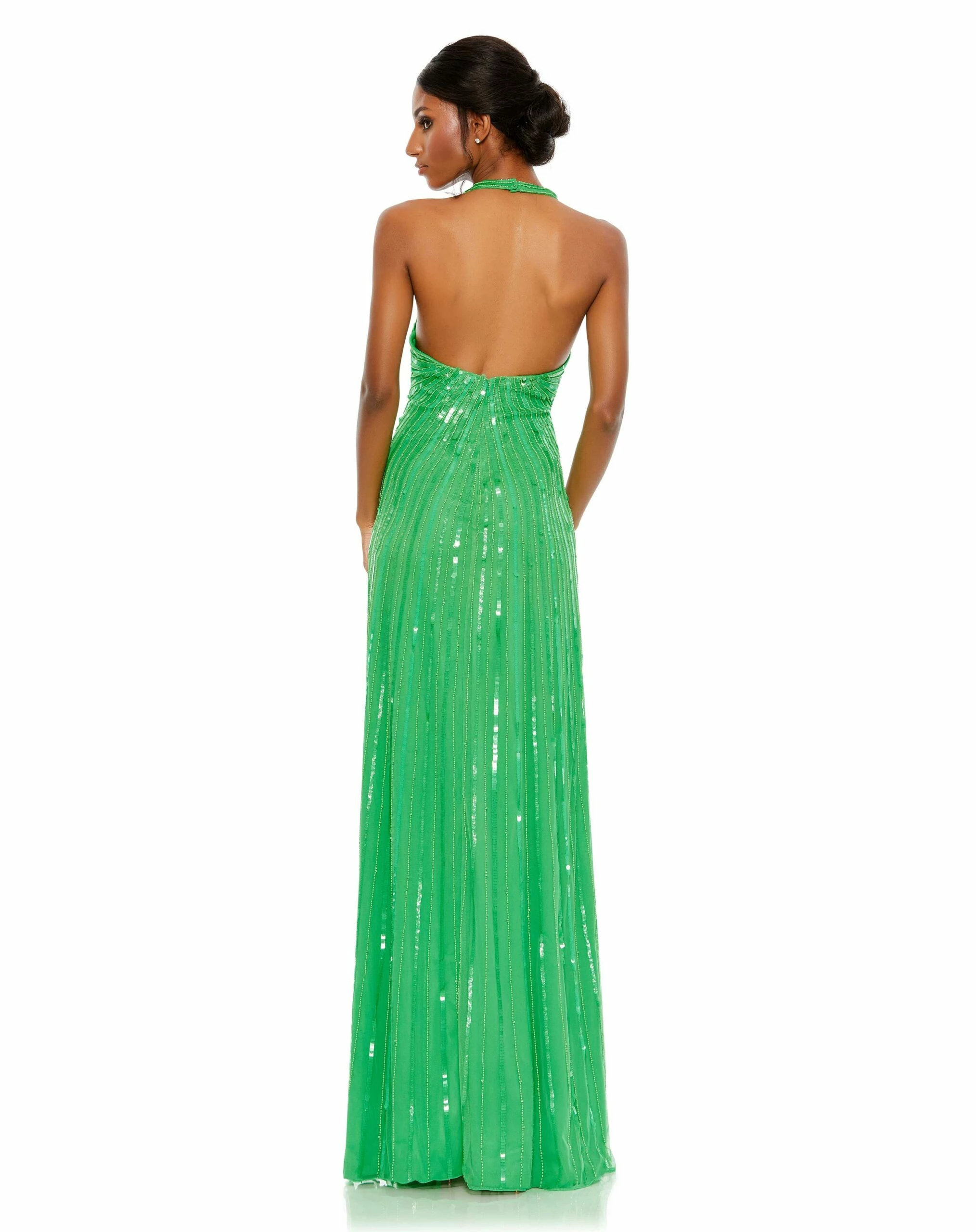 Take picturesâand more picturesâto show off how fabulous you look in our halter gown embellished with rays of sequins and beads. The dressâ sleek, modern cut, shimmering detail, and deep V-neckline ensure you take center stage. Â