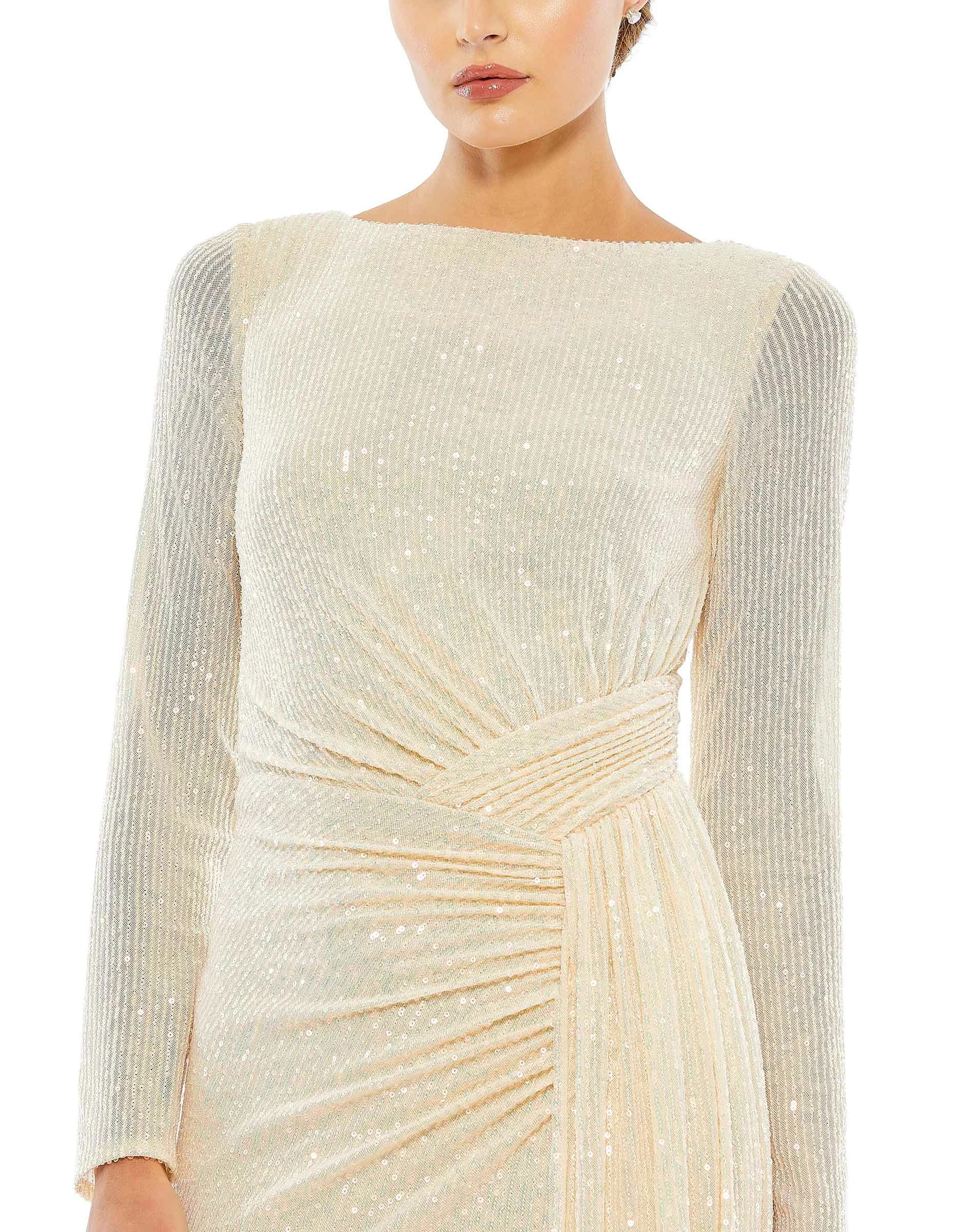 Sequined Ruched Long Sleeve Boat Neck Gown