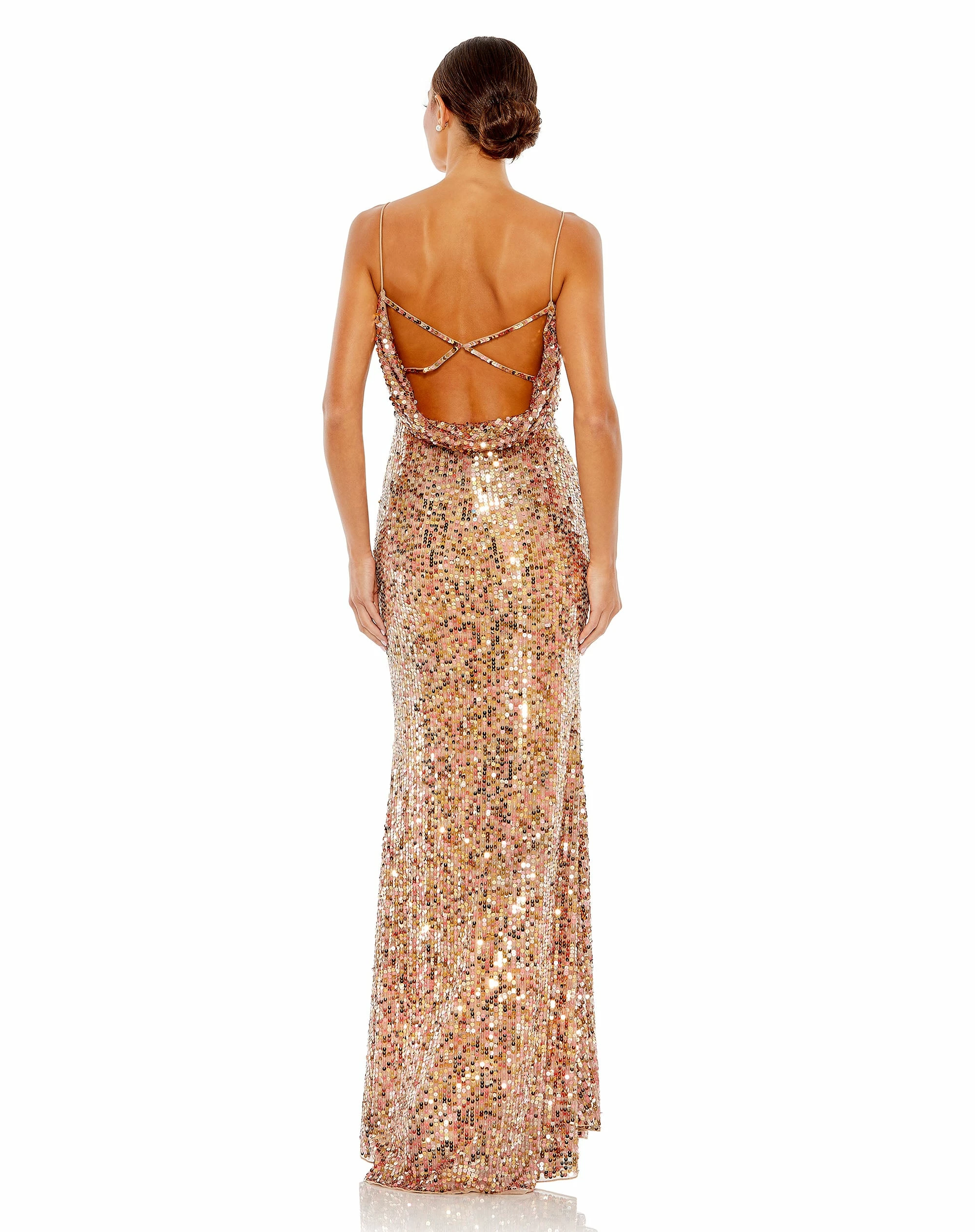 Wearing this tonal-sequined gown turns you into a real-life shining star. Steal the spotlight in the attention-grabbing dress designed with a V-neckline, delicate spaghetti straps, and a feminine, softly flared hem. Of course, all great dresses need to look fabulous coming and going, so we added crisscross straps and a cowl accent to the back.