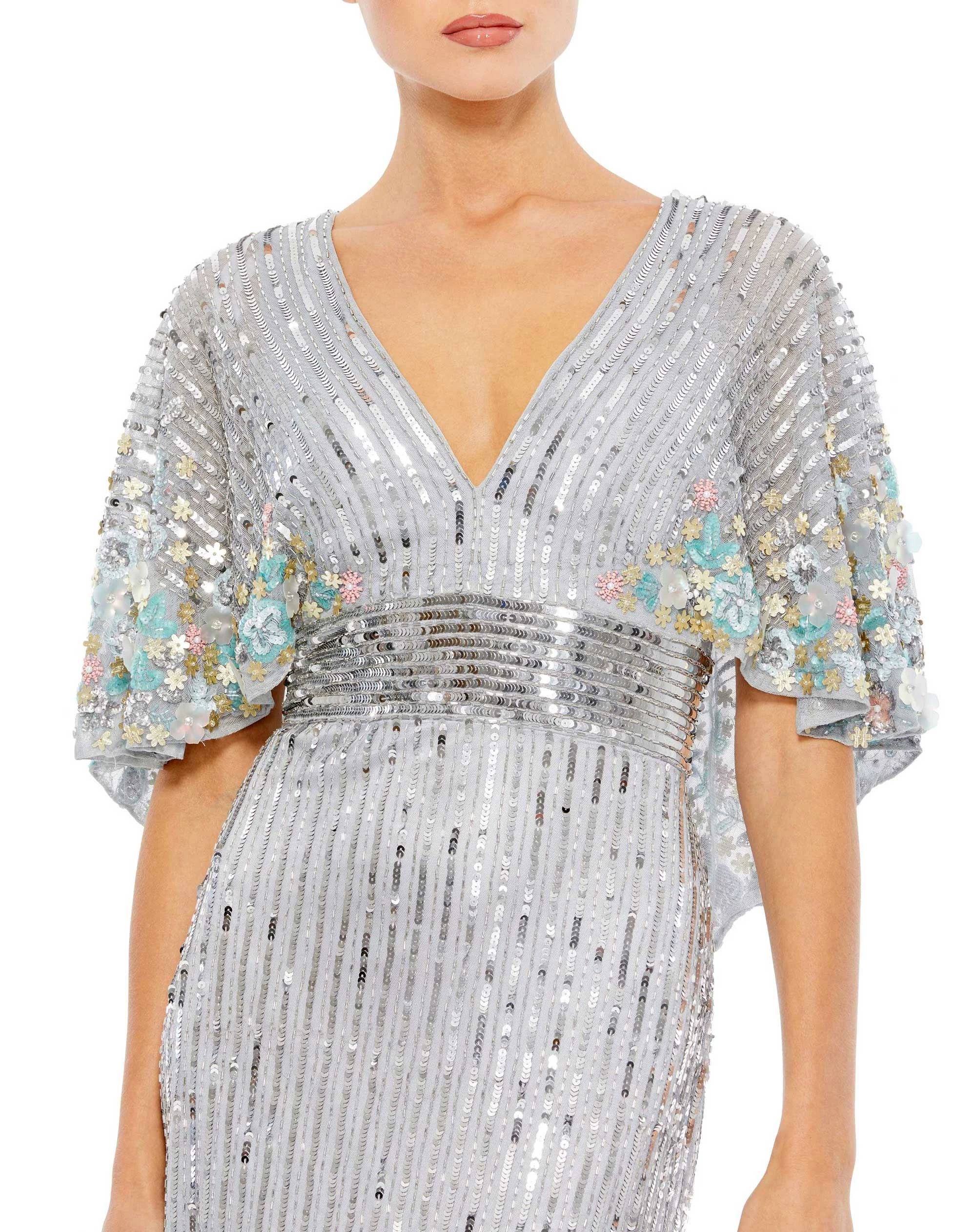 Sequined V Neck Floral Embellished Cape Sleeve Gown